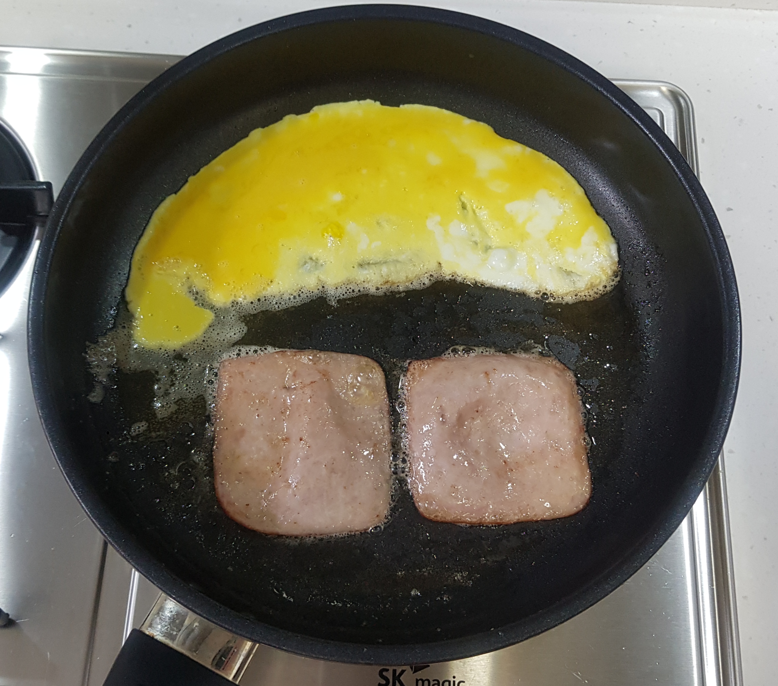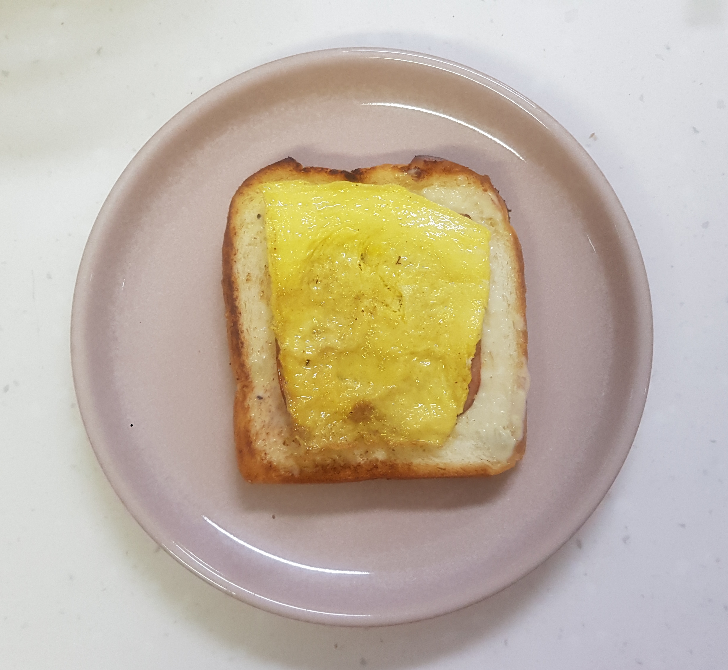 식빵을 구운 후에 버터를 또 한숟가락 녹이고 햄과 달걀을 부쳐주세요.
