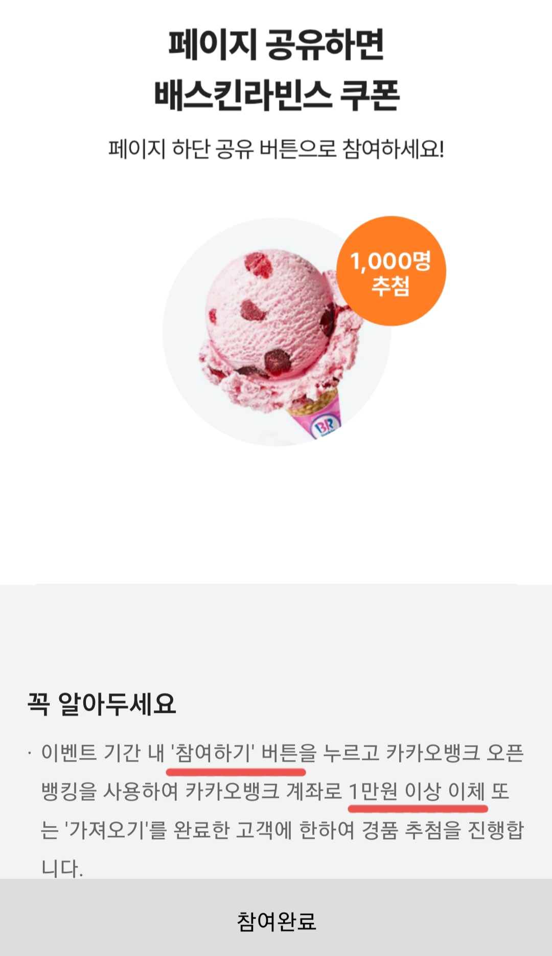 친구에게 이벤트를 공유하면 1,000명을 추첨해서 배스킨라빈스 쿠폰을 받을 수 있어요.이건 가능성이 조금 있어 보이니 공유해 보세요😁