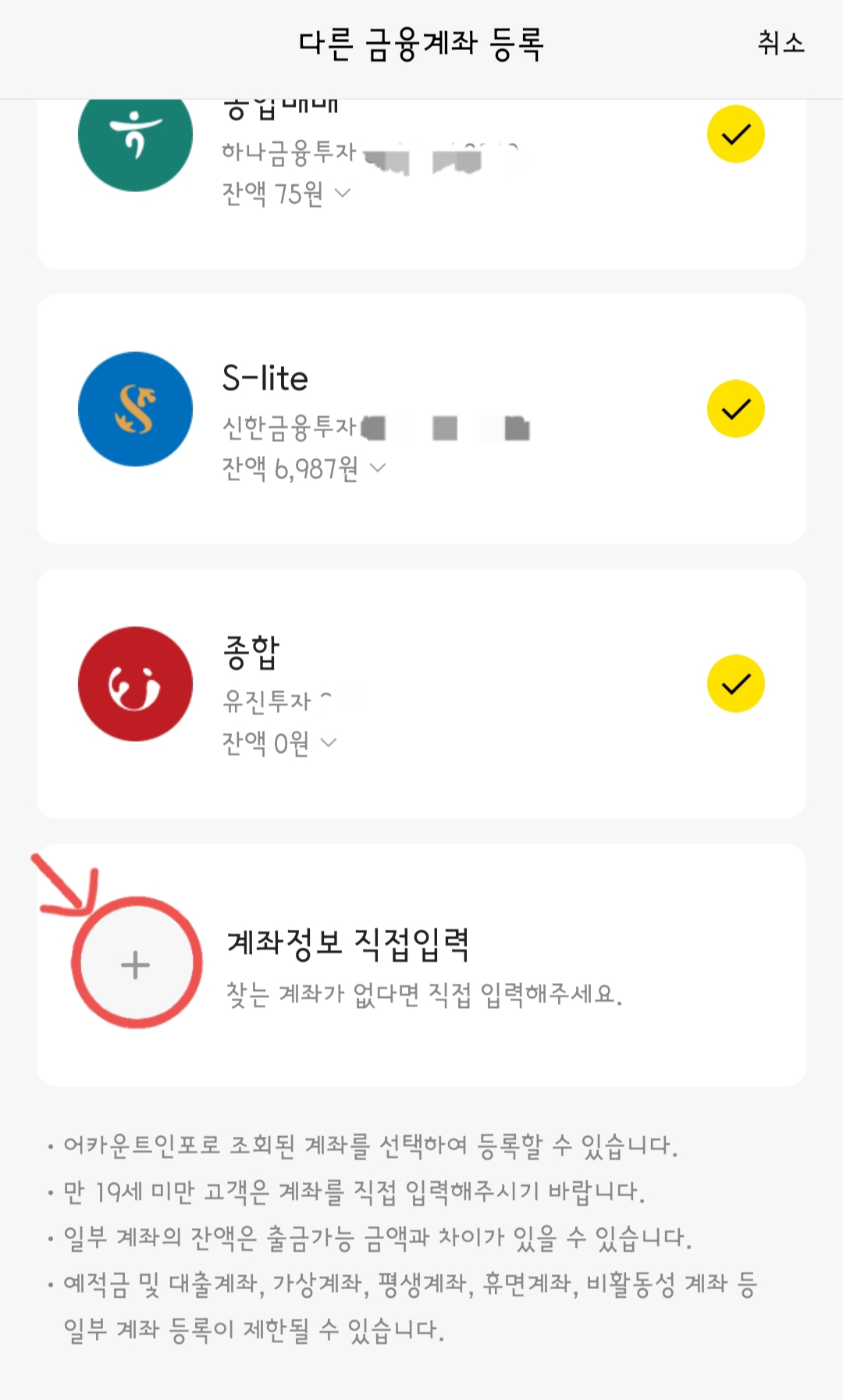 혹시 자동으로 연결되지 않은 계좌가 있다면 직접 입력하여 연결하는 방법도 있으니 참고해 주세요.
