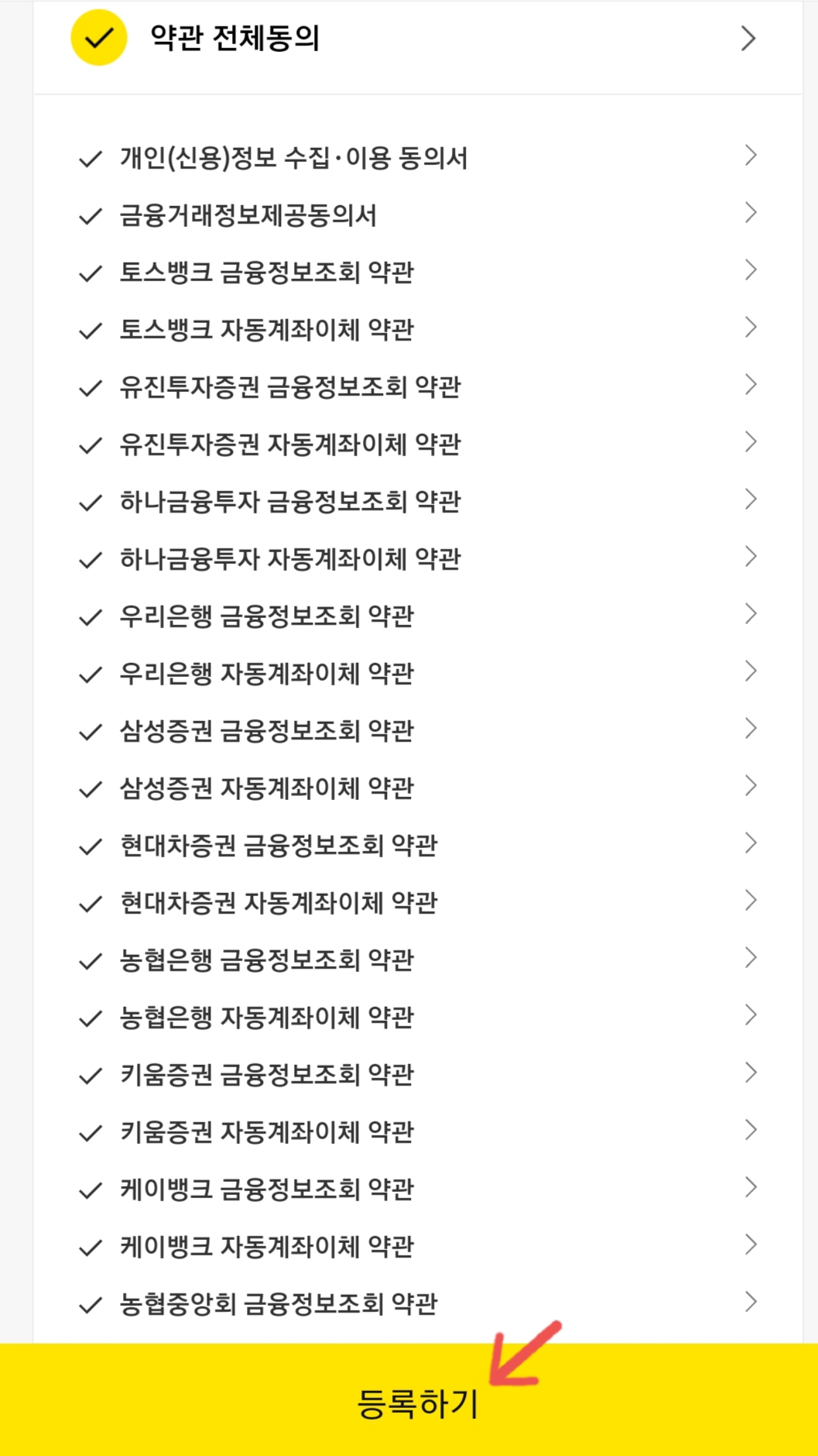 각 은행과 증권사 조회 약관에 모두 동의를 해요.