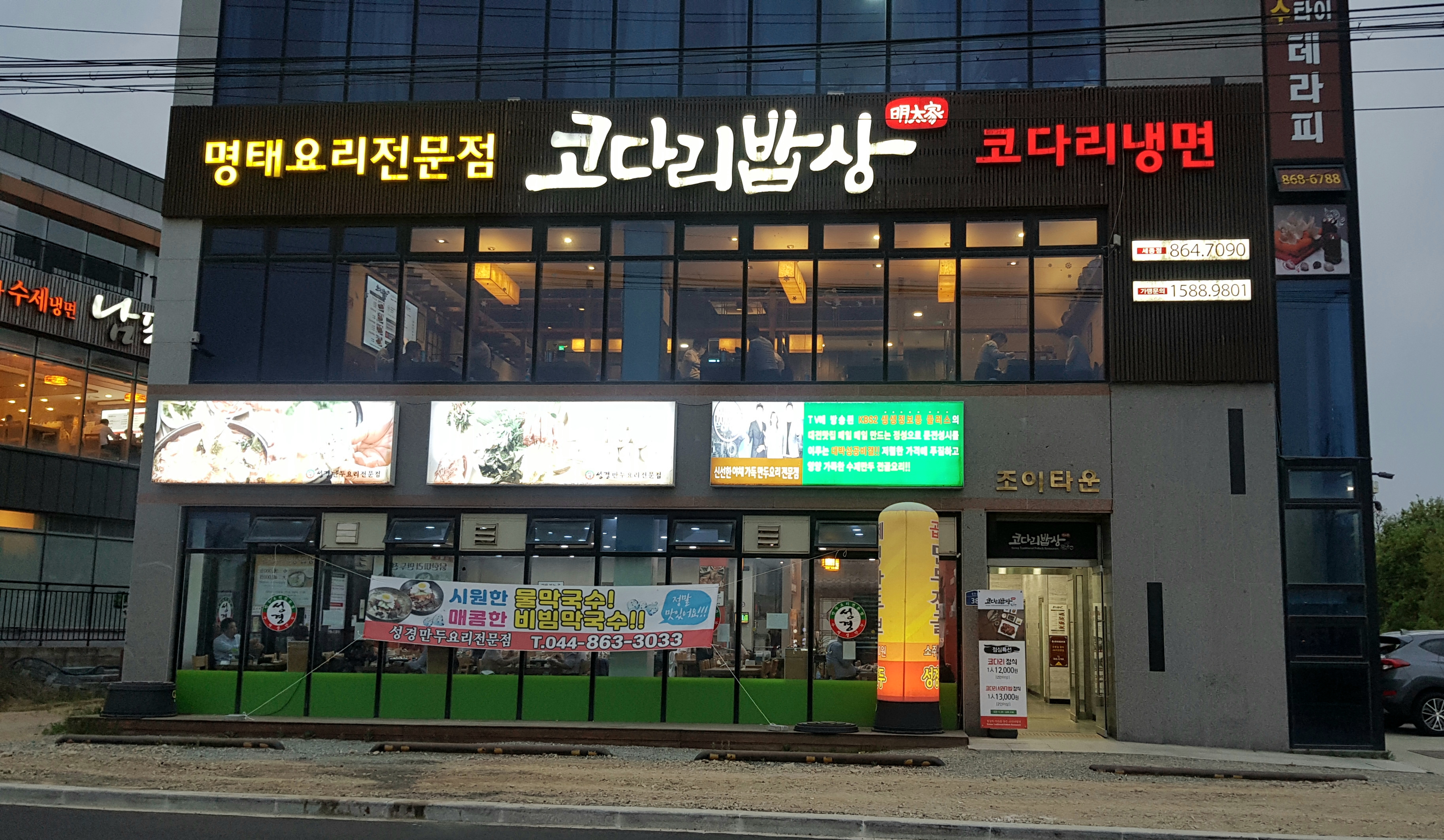 코다리밥상은 바깥에 주차장이 함께 있는 상가건물 2층에 있어요.