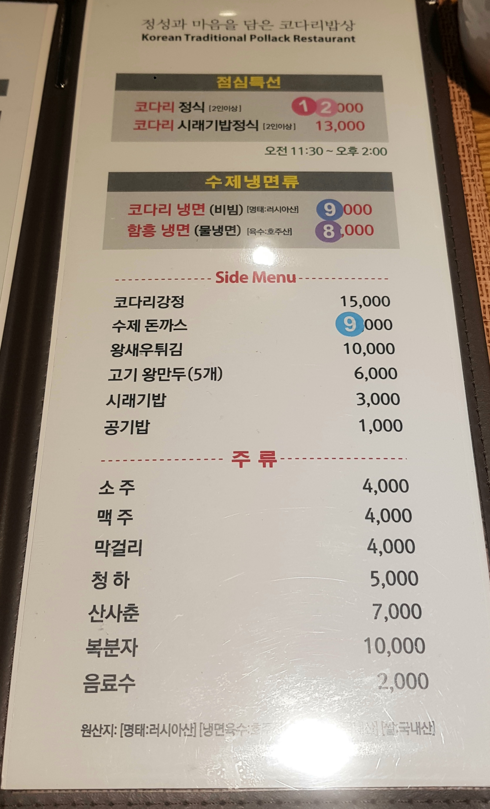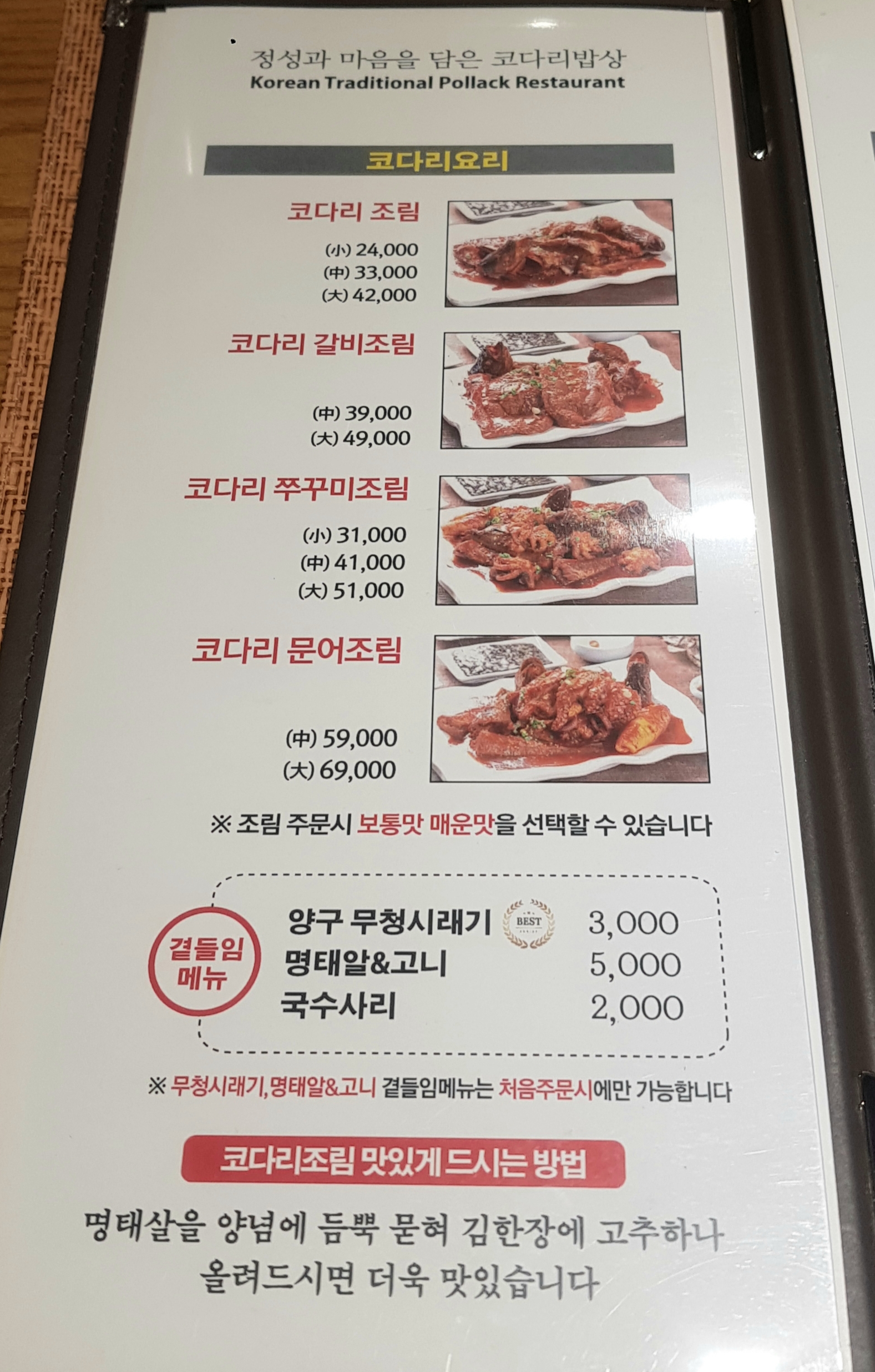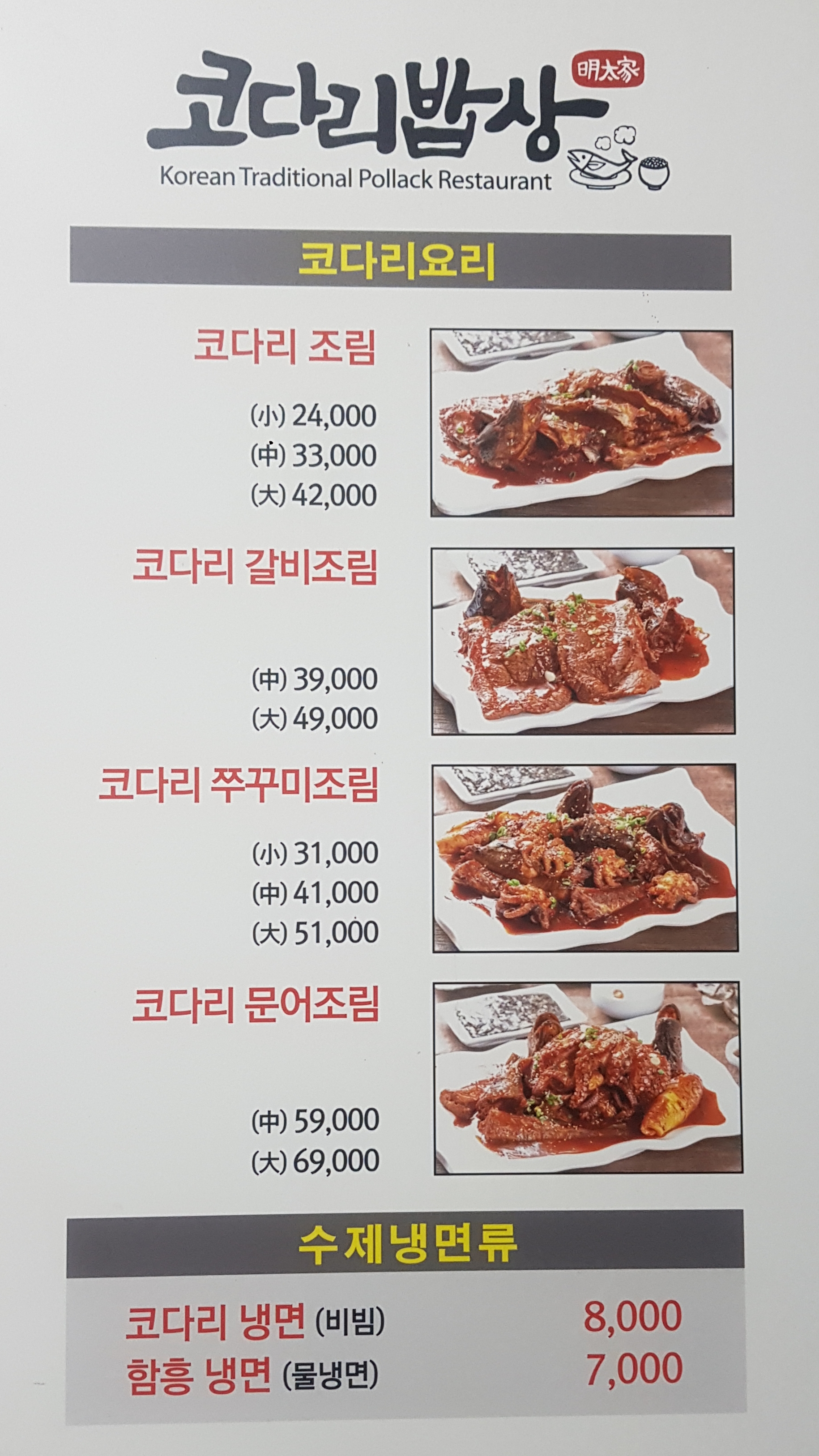 코다리(명태) 요리가 주 메뉴이고 코다리 갈비조림, 쭈꾸미, 문어조림도 있어요.