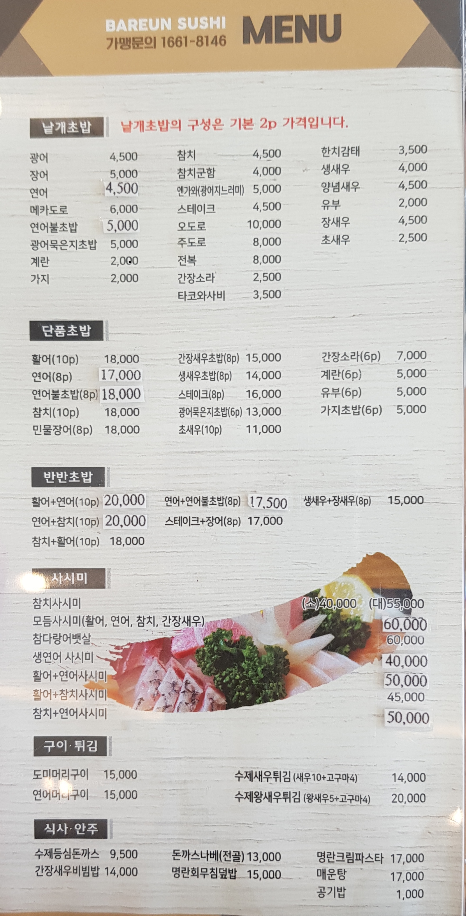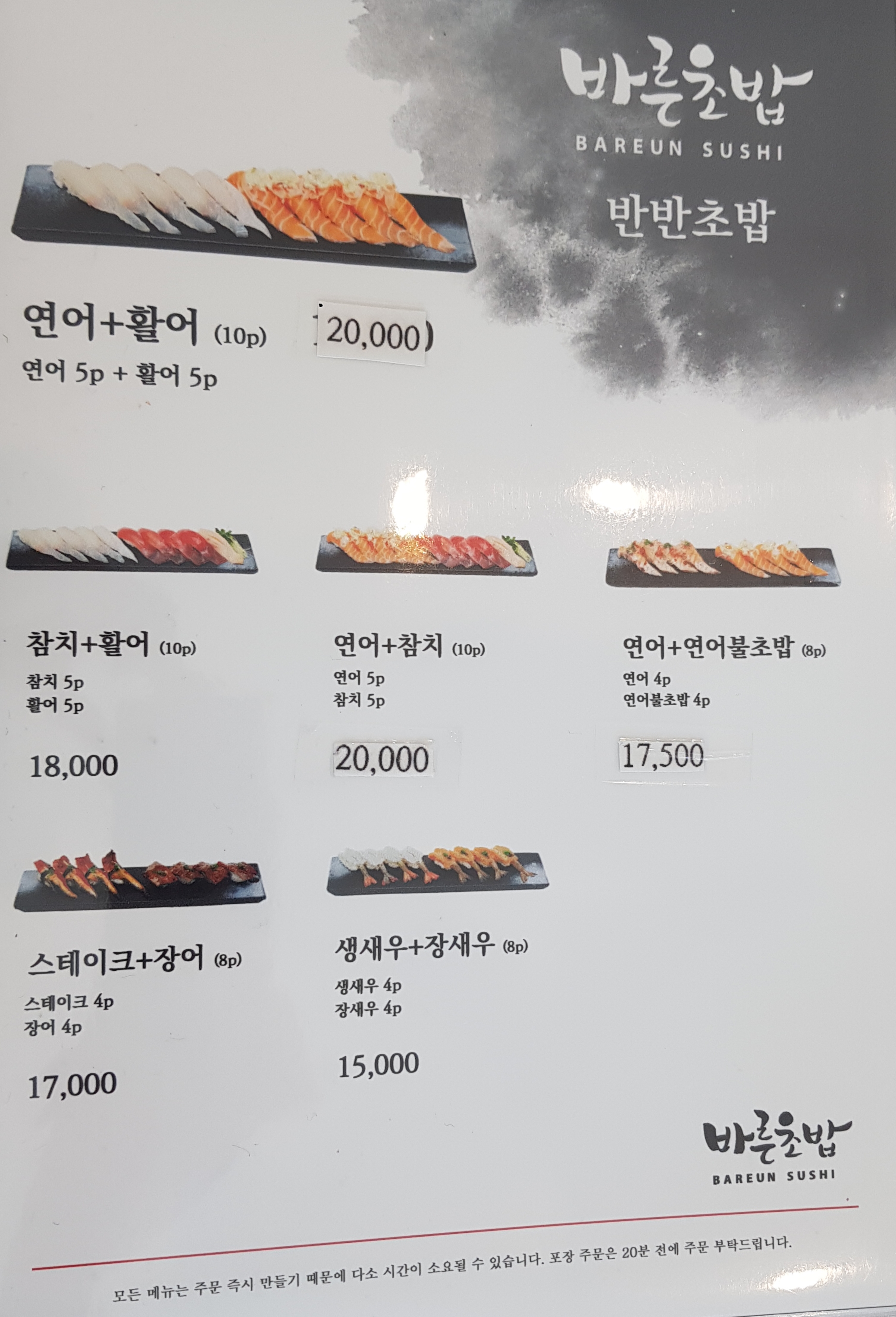 초밥 구성은 다양하게 있고, 낱개로도 주문할 수 있어요.