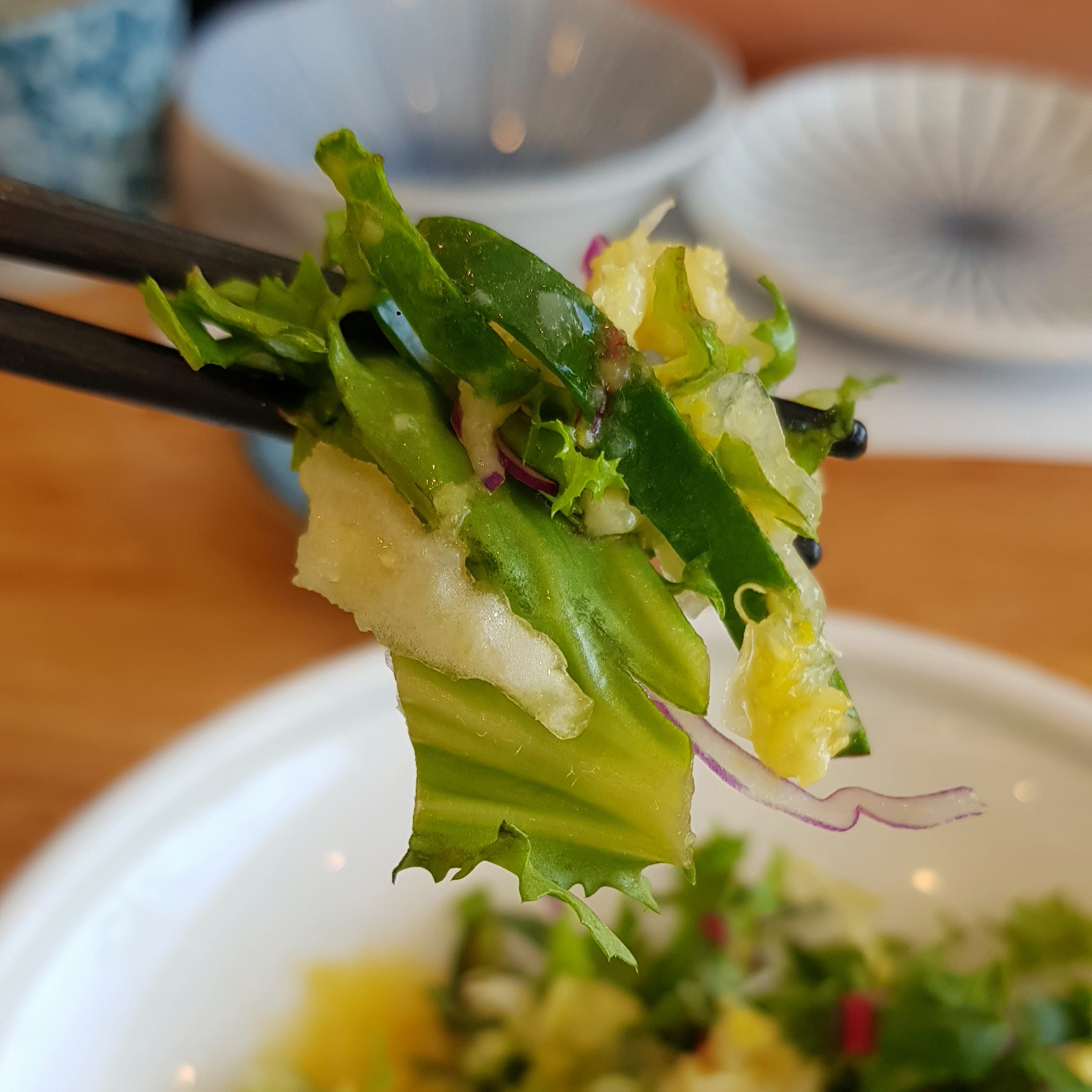 샐러드가 나왔는데 드레싱이 새콤달콤한 게 평소 먹어보지 못한 맛이었어요.
