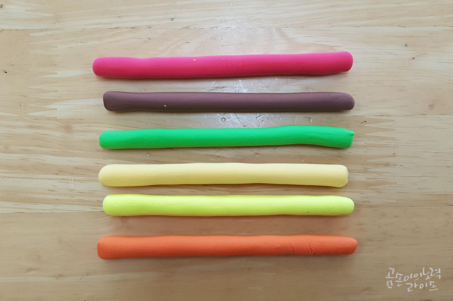 흰색 폼 클레이, 클레이 점토(검은색, 노란색, 주황색, 초록색, 빨간색, 갈색 등), 점토놀이용 도구, 밀대