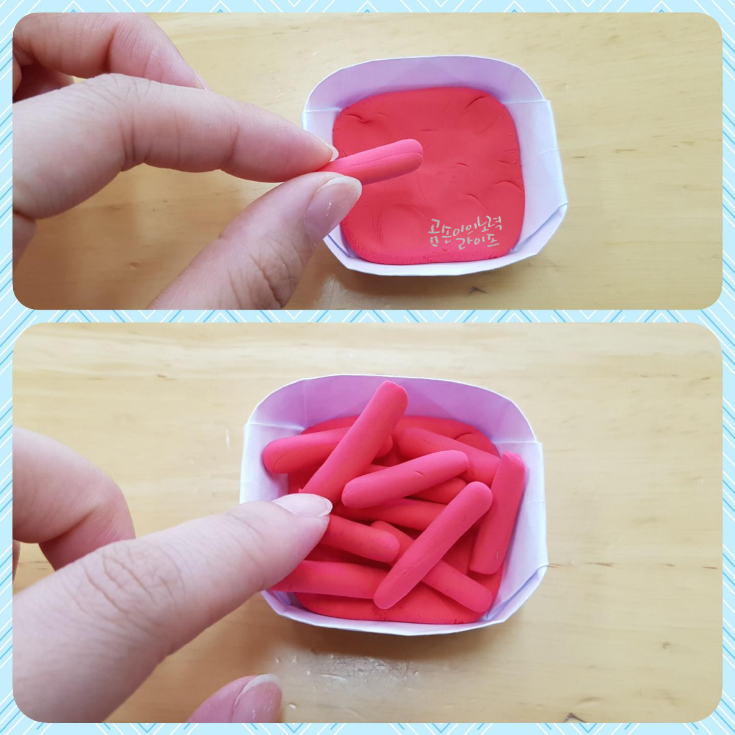 이번 시간에는 분식집 놀이할 때 사용하려고 여러 가지 음식을 만들어 보았습니다.