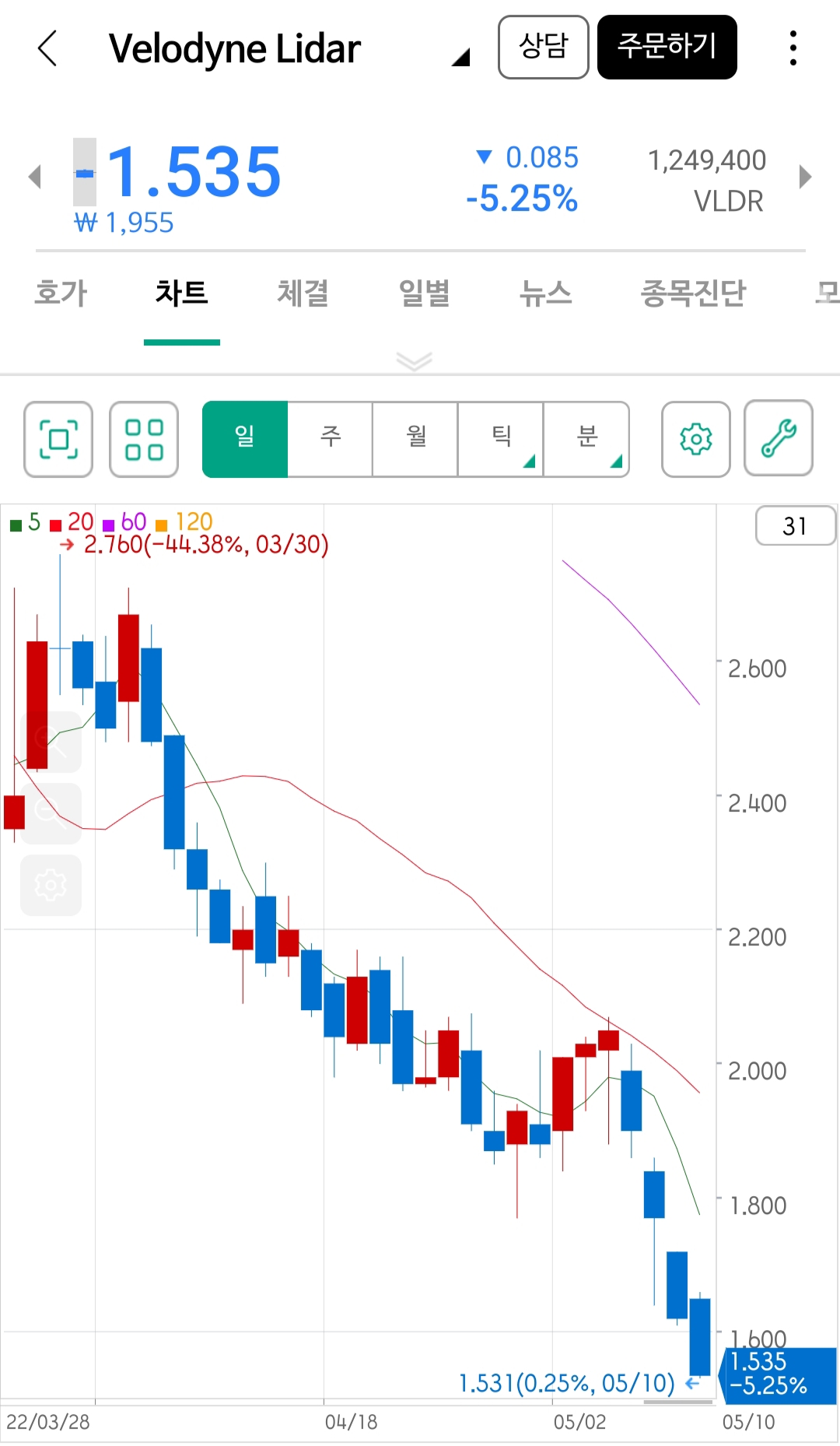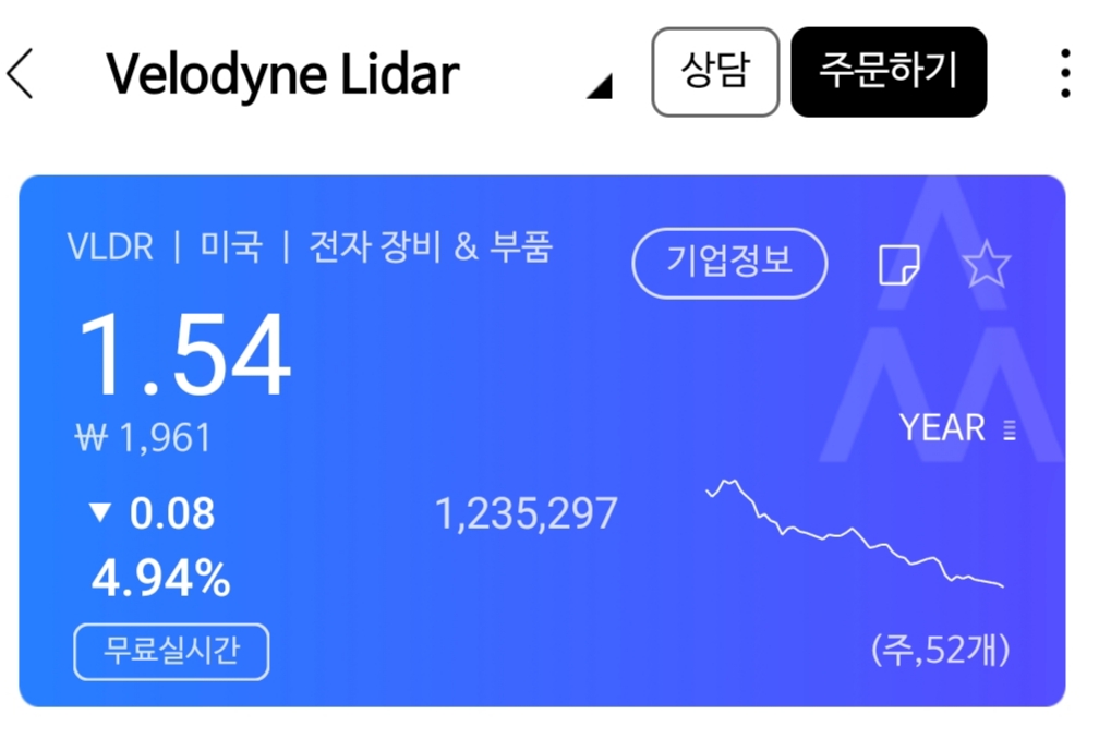 선물로 받은 미국 주식은 벨로다인 라이다 라는 종목인데 가격이 2,000원이 안되네요.