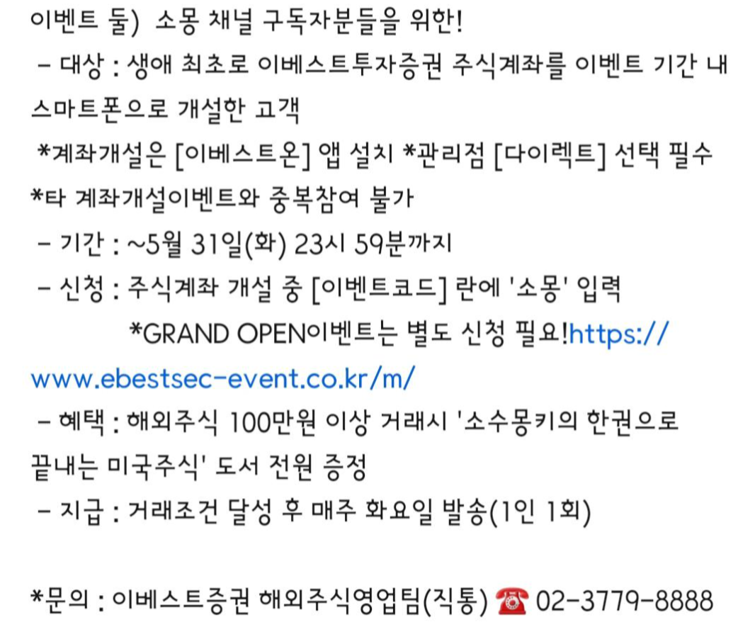 지금까지 이베스트 투자증권 계좌 개설하고 한국 주식 1주 받는 방법을 알려드렸습니다.더불어 현재 해외주식에 투자 중이시거나 이제 막 시작하 시분들은 이베스트 투자증권에서 100만 원 이상 해외주식 거래하고 미국 주식 1주와 소수몽키의 책도 받으시길 추천드려요.