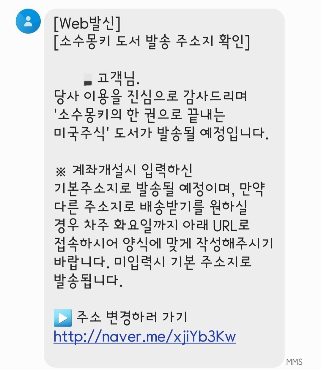매수 이후 바로 미국 주식 1주와 소수몽키님의 책을 받을 수 있다는 문자가 와요.