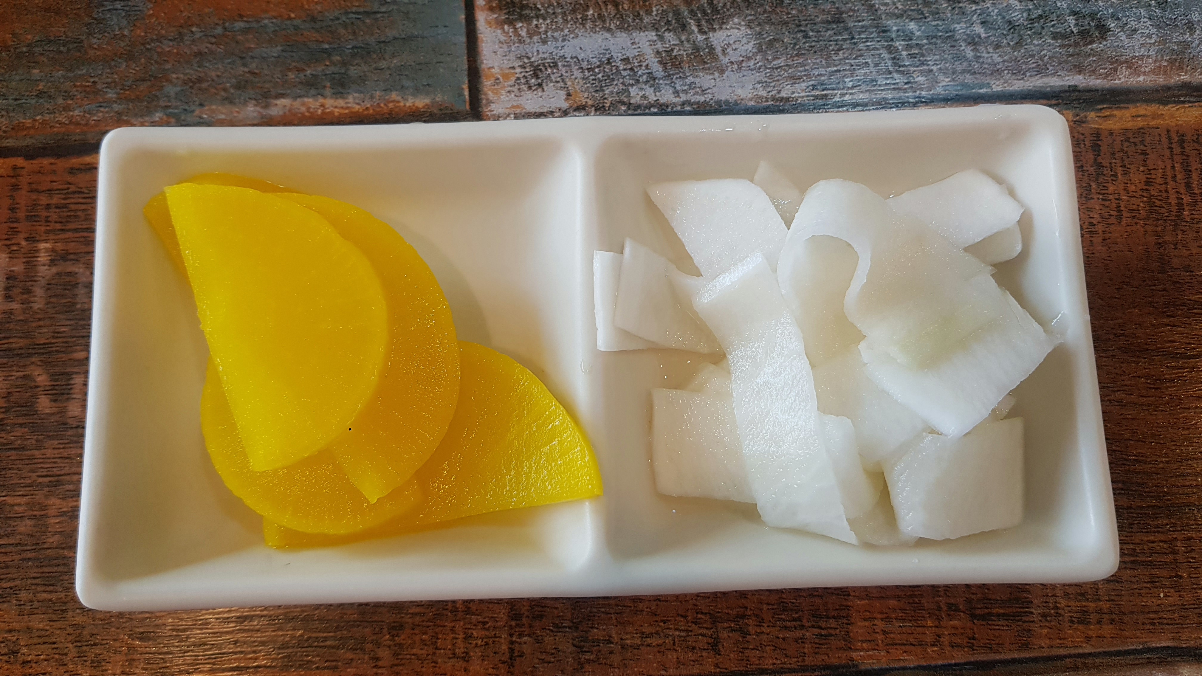 기본 반찬은 단무지와 무 초무침이 있고, 셀프코너에서 추가할 수 있어요.