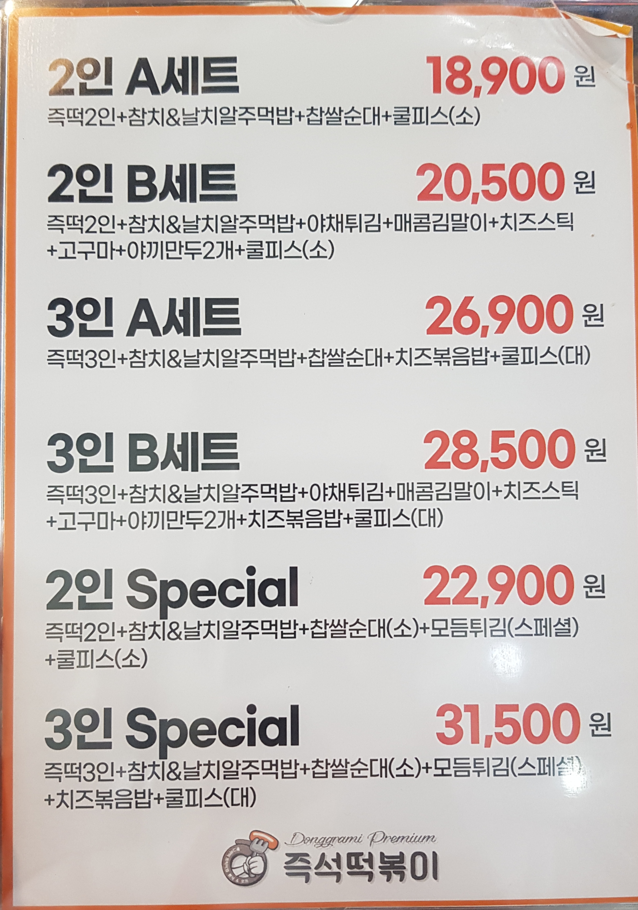 메뉴는 크게 떡볶이, 밥, 토핑(사리, 튀김 등)이 있고, 세트 메뉴도 있어요.