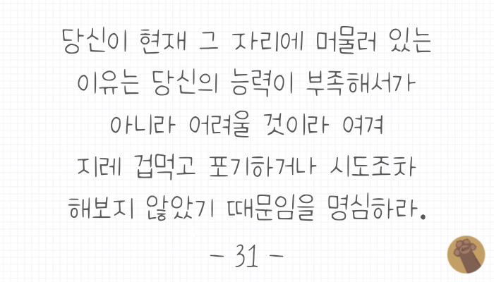 멘탈이 흔들리거나, 내가 가는 길이 맞나 싶을 때, 힘들다고 느껴질 때 등, 언제든 다시 보면 다시 마음을 다잡을 수 있는 명언 모음집이라고 해도 과언이 아니에요.