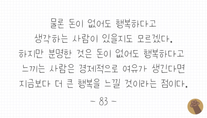 행복은 돈으로 살 수 없다고 하지만 돈이 있다면 그보다 더 큰 행복을 느낄 수 있다는 말에도 크게 공감해요.