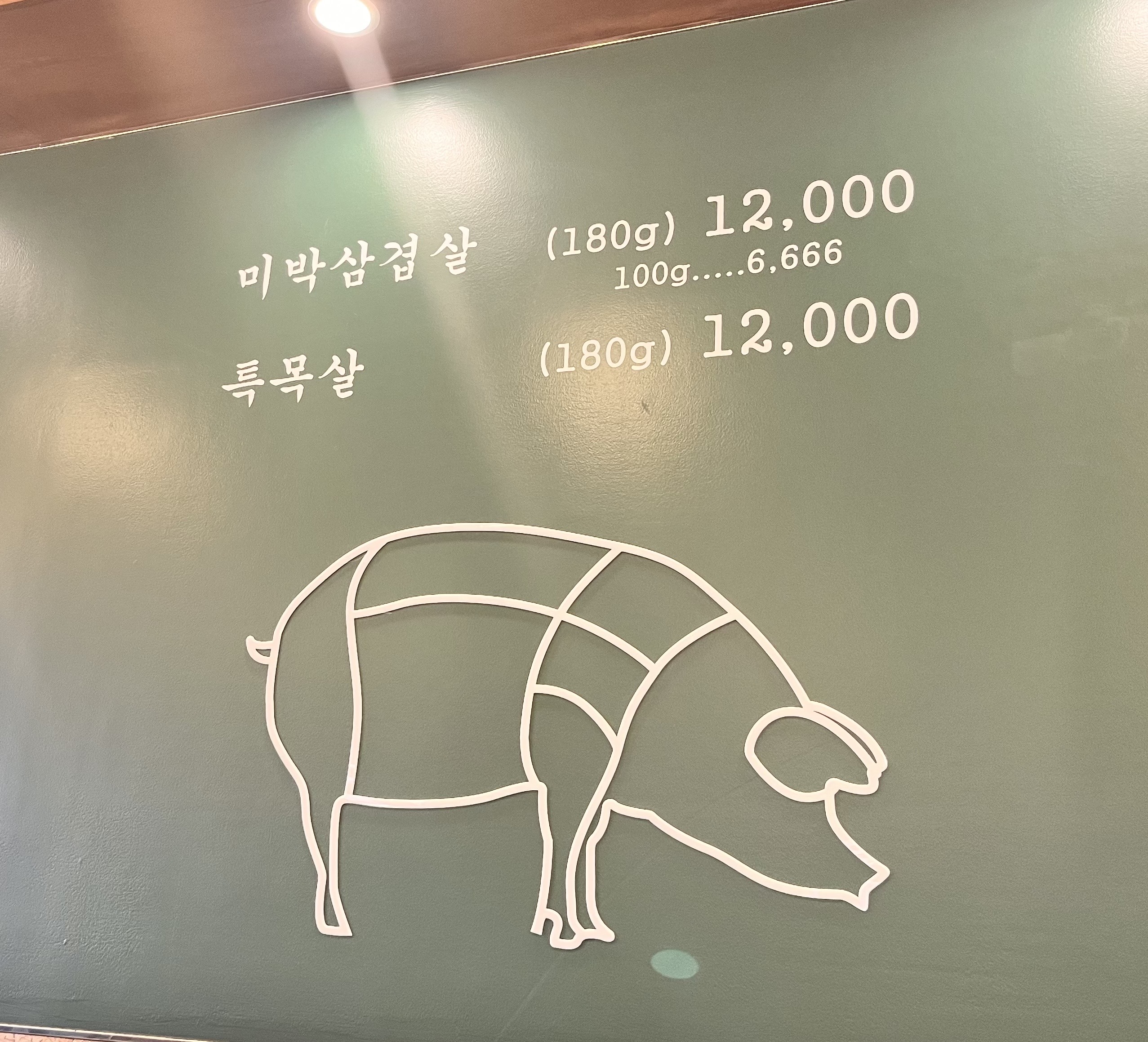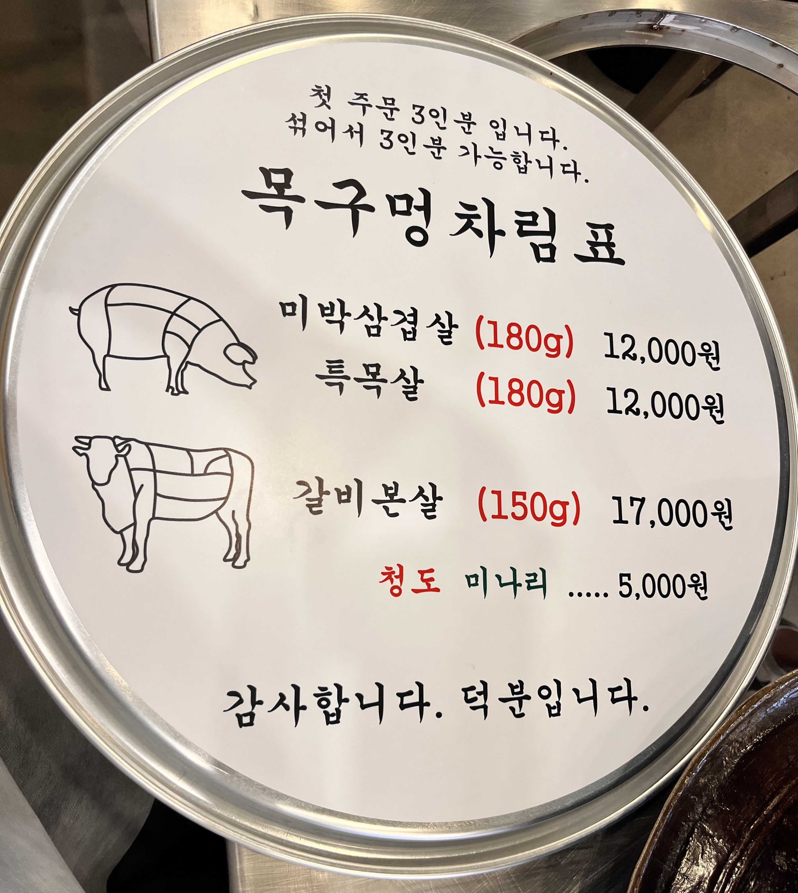 메뉴는 미박삼겹살(껍데기가 살짝 붙어있는 삼겹살)과 특목살, 소갈비본살이 있고, 다양한 식사류도 있어요.