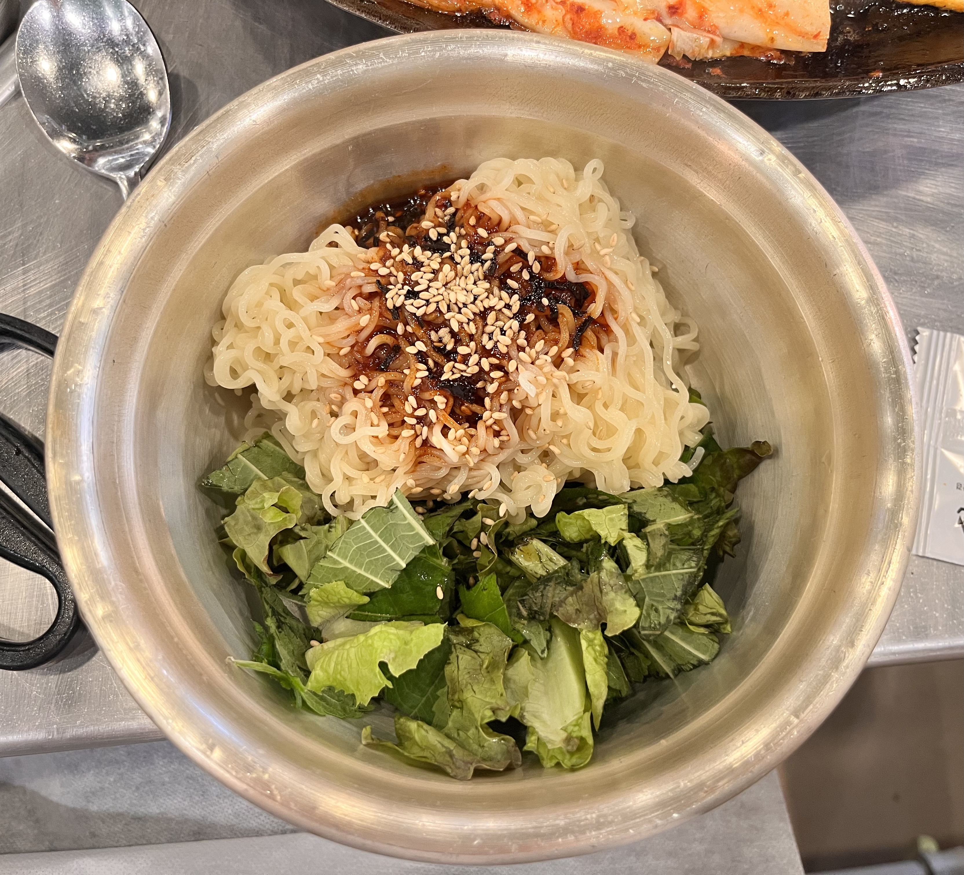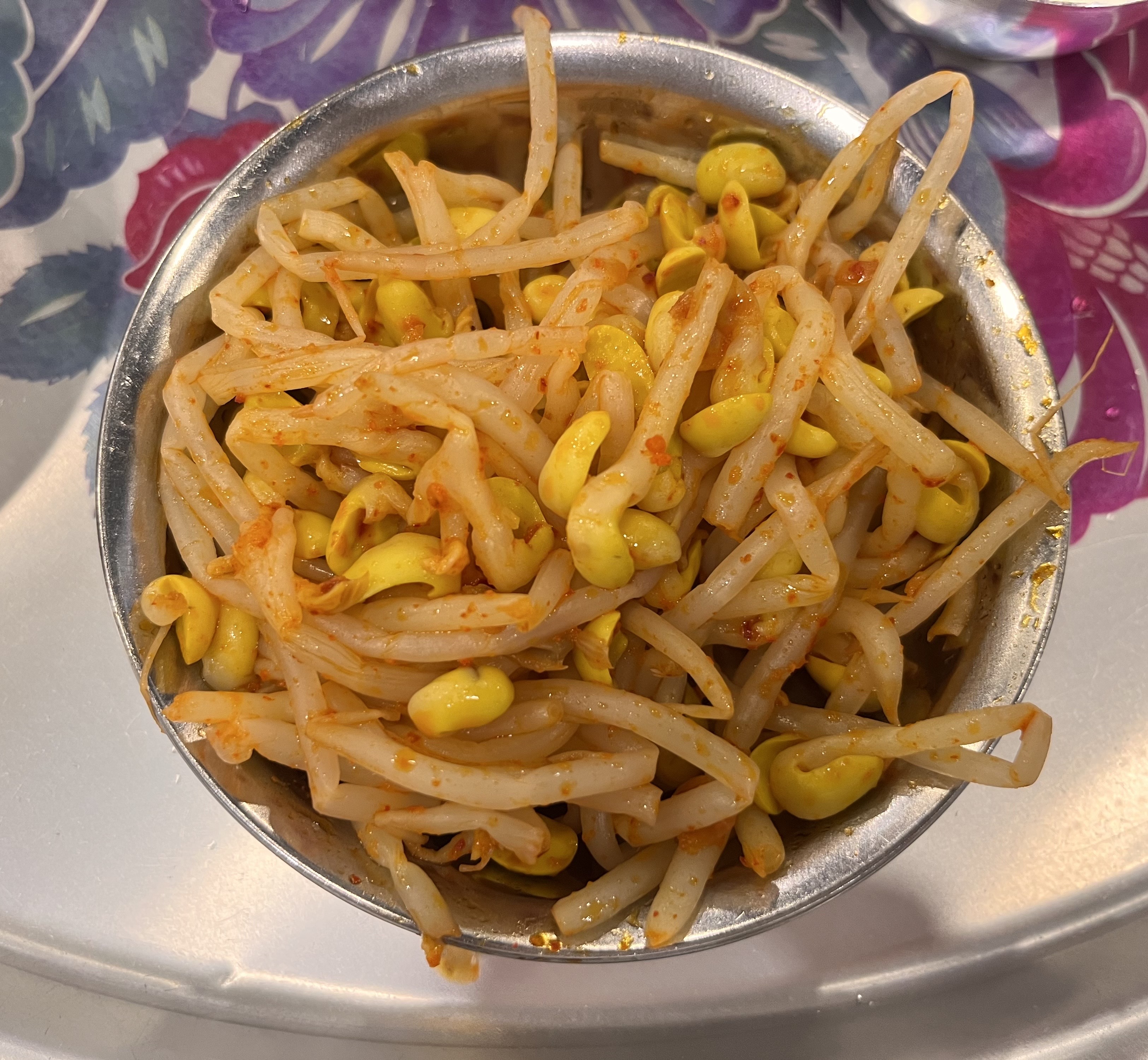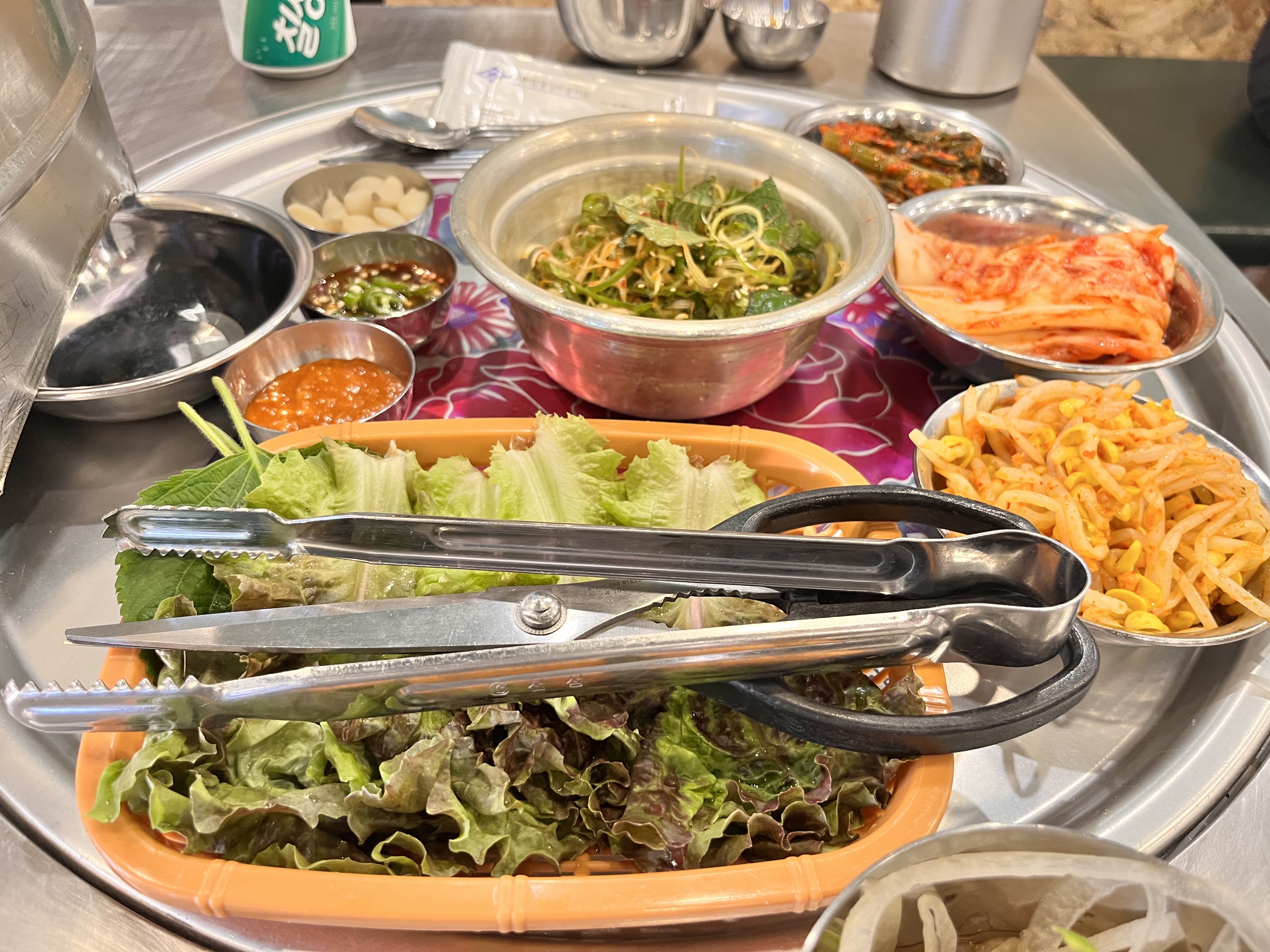 갓김치와 김치, 콩나물도 나오고요.이것들은 고기랑 다 같이 구워 먹어요.