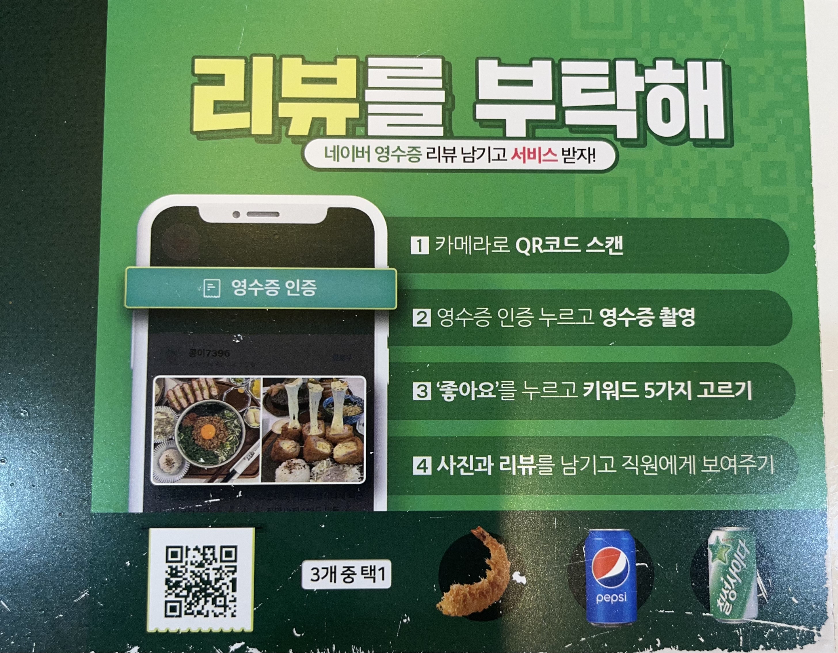 아쉽지만 다음에 하려고 했는데, 사장님이 리뷰하라고 알아서 영수증을 재발급해주셨어요.
