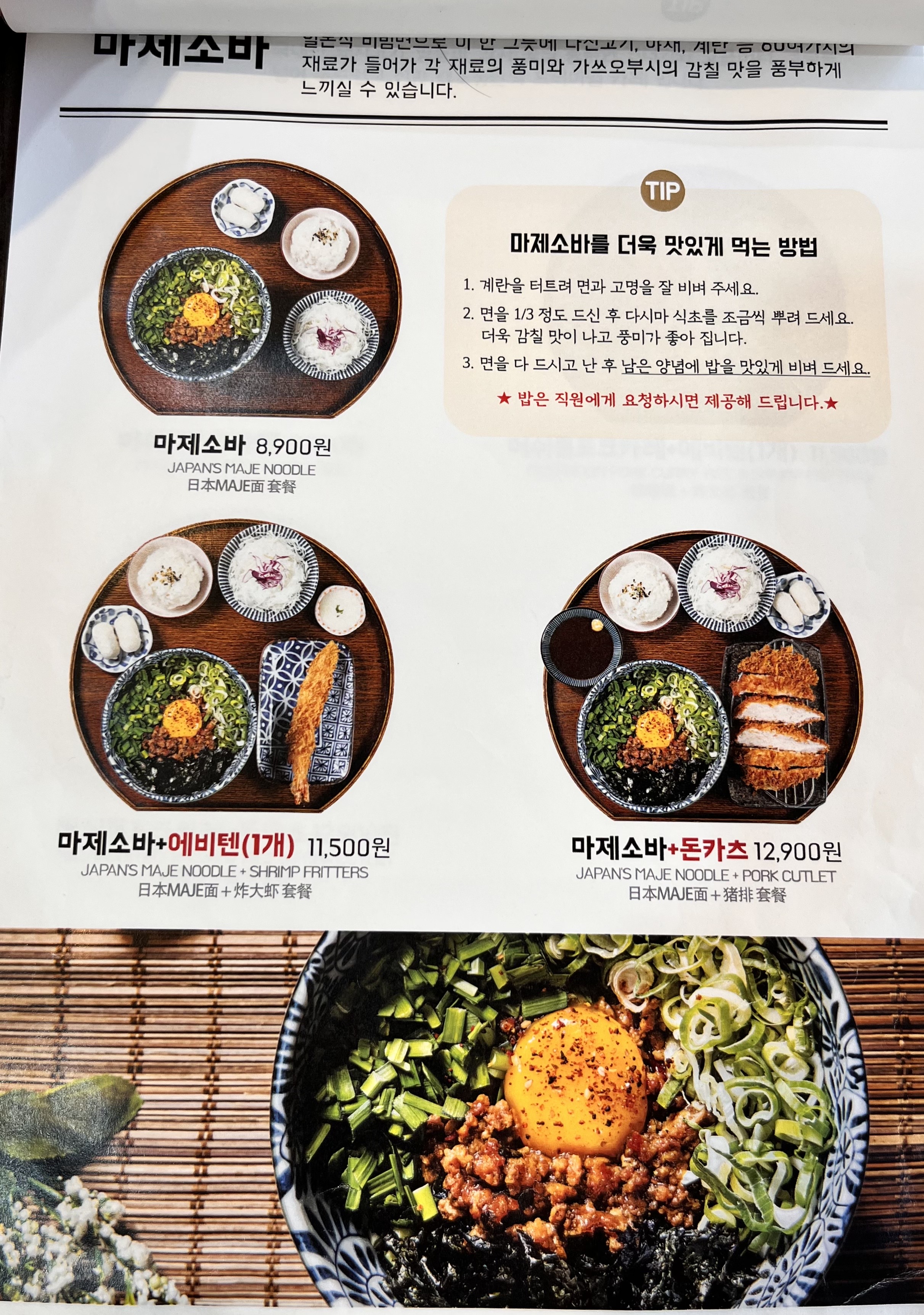 그래도 이곳은 마제소바가 시그니쳐 메뉴라고 하니, 마제소바와 치즈모듬카츠를 주문했어요.