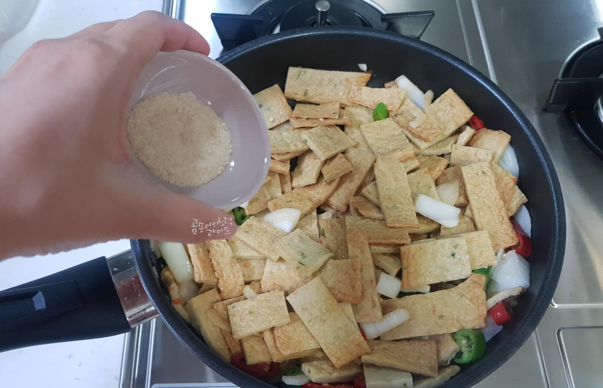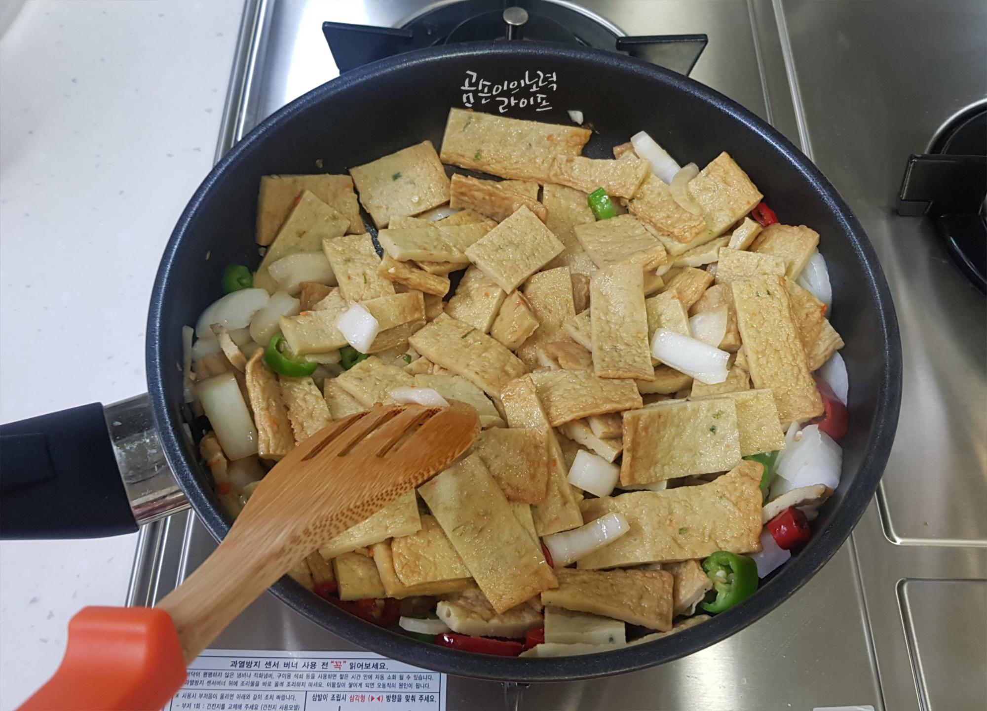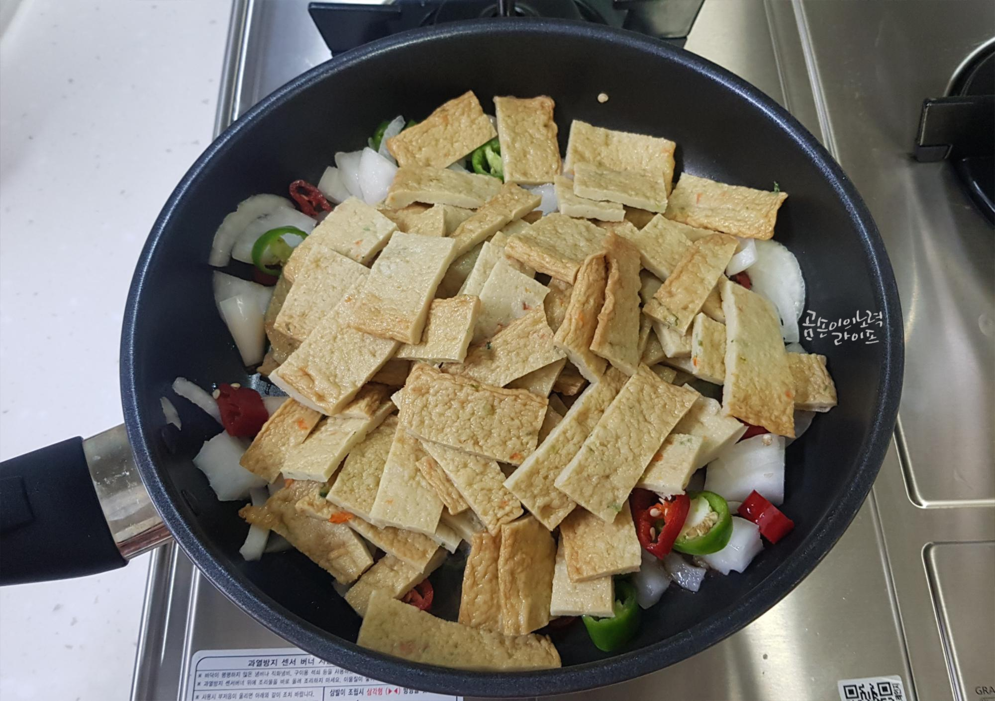 양파가 살짝 노릇해지면 어묵을 넣어줍니다.