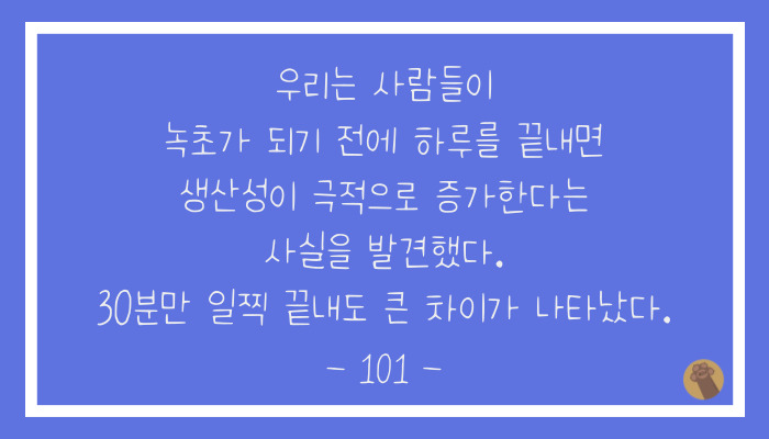 체력이 바닥났을 때 억지로 일하다 보니 효율도 떨어지고 결과적으로 더 많은 시간을 사용한 게 되어버리죠.