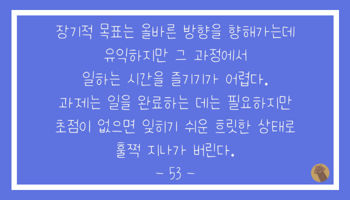 장기적 목표만을 가지고 산다면 뜬구름 잡는 것 같고, 앞으로 한 발짝도 나아가지 못하는 무기력한 기분을 가져다준다면, 아주 작게 쪼갠 과제는 성취감을 느낄 수 있지만 반드시 완수해야 할 임무와 같아서 그 과정을 즐길 수 없다는 거예요.