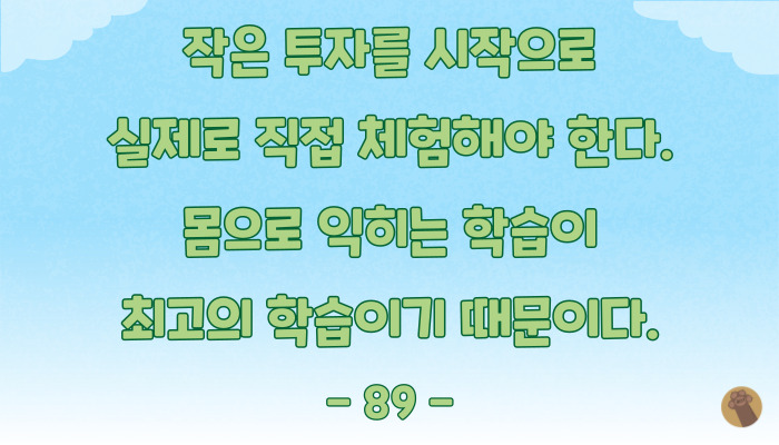 당장 엉덩이를 뗀다는 게 두렵고 어려운 일이지만, 작게라도 투자를 시작해서 소소한 수익실현까지의 과정을 한 바퀴를 돌려보면 가지고 있었던 실체 모를 두려움은 사실 별게 아니었다는 것을 알게 될 거예요.