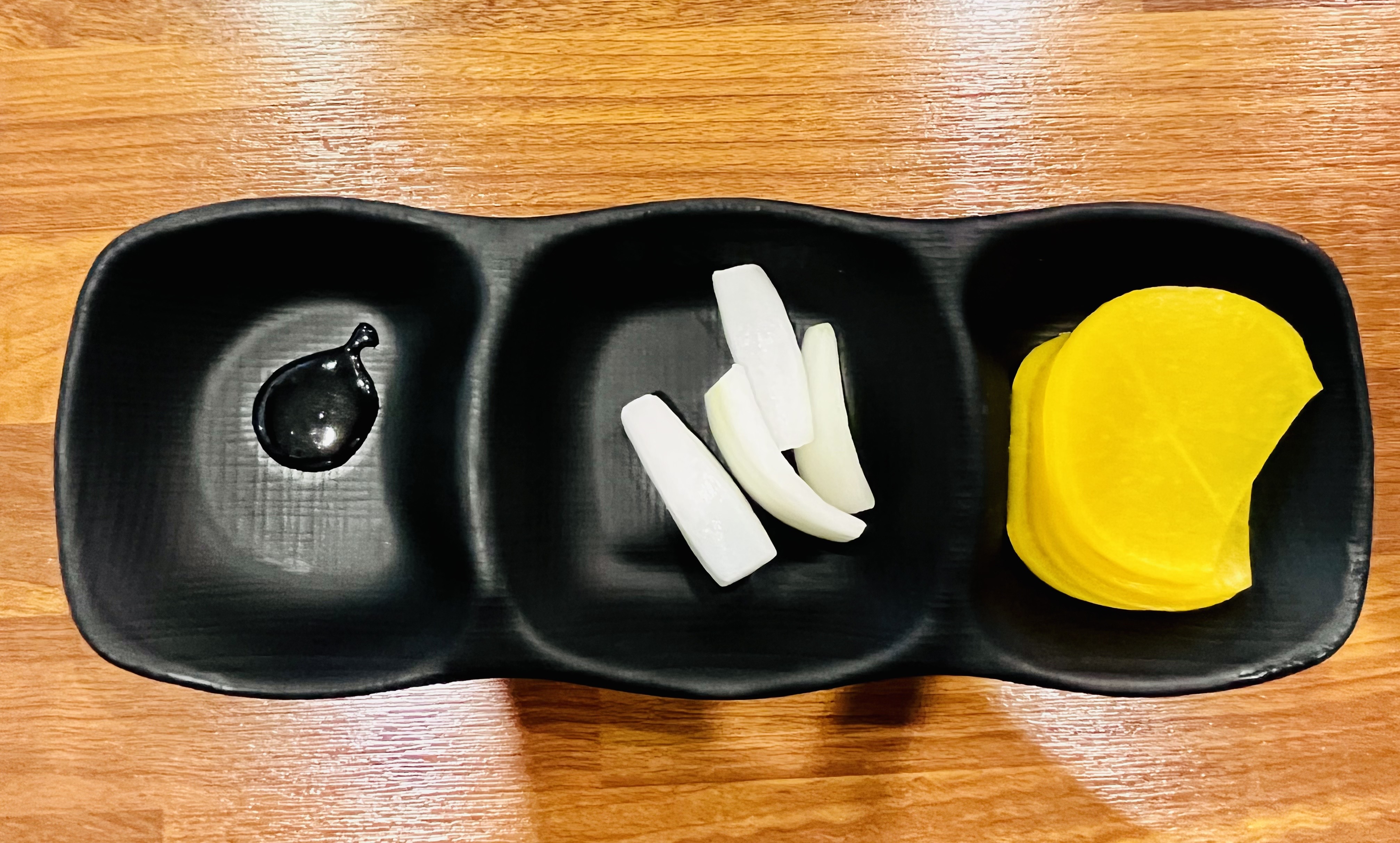기본 반찬은 단무지와 양파가 나오고요.
