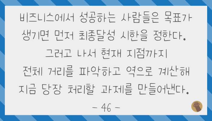 이렇게 계획할 때 시간을 거꾸로 거슬러 오르다 보면 지금 당장 무엇을 언제까지 완수해야 하는지 명확해집니다.