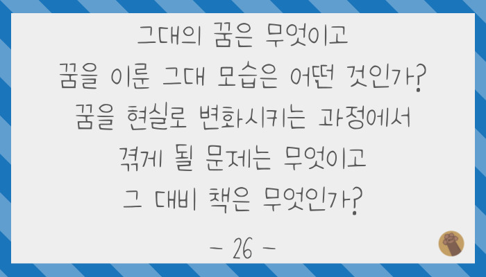 바라던 일을 이루기 위해서 오늘 당장 할 수 있는 일이 무엇인가를 찾아서 바로 시작하는 게 핵심이에요.