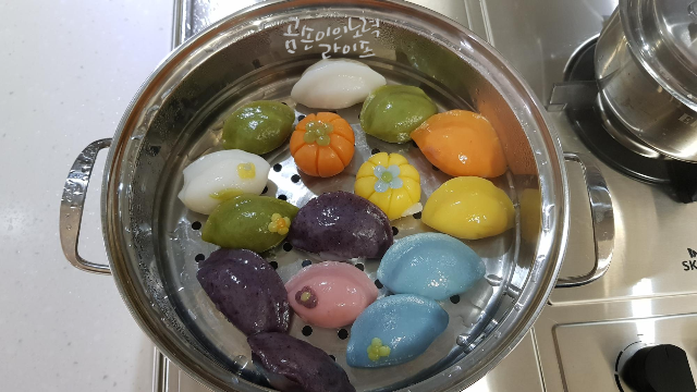 찜기가 데워지면 송편을 넣고 20분간 쪄줍니다.