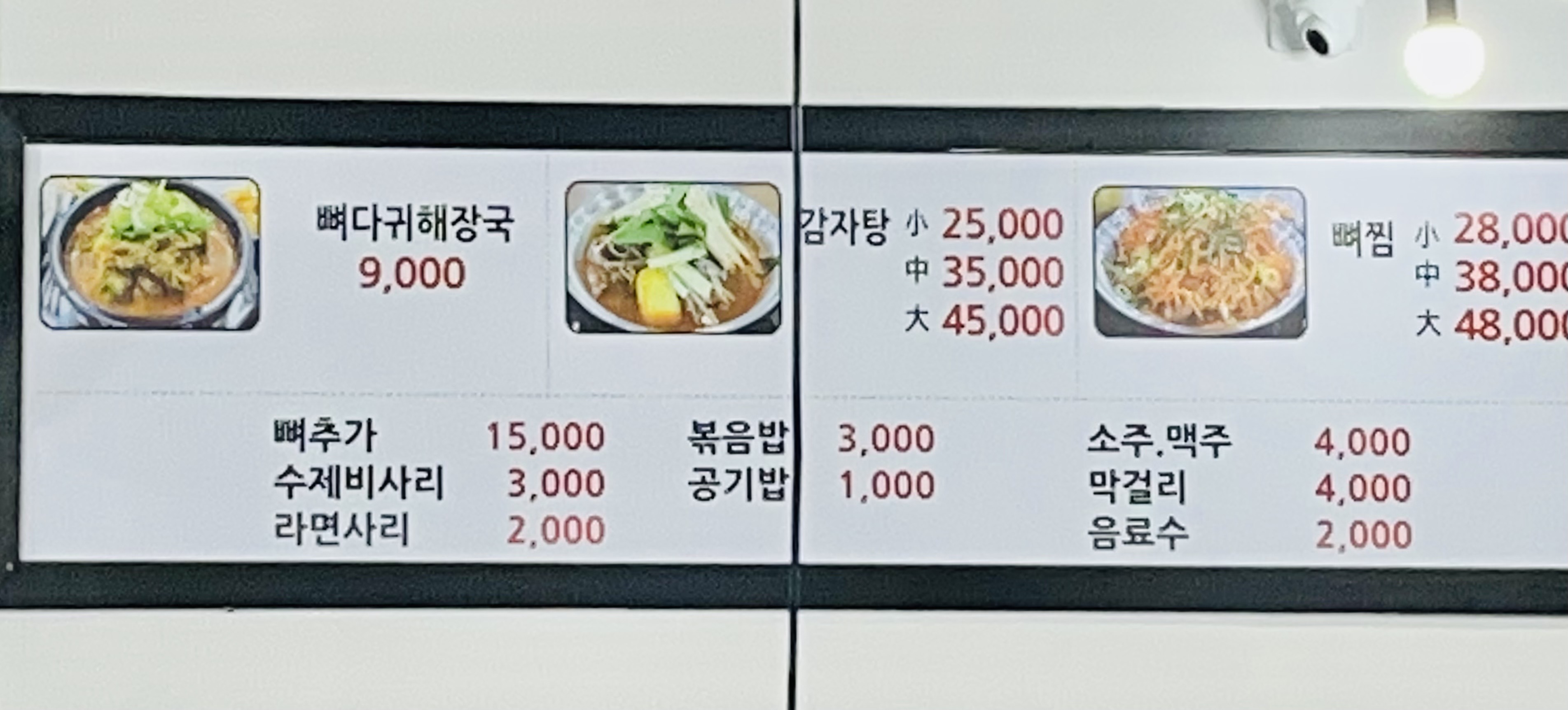 메뉴는 뼈다귀 해장국과 감자탕, 뼈찜이 있어요.