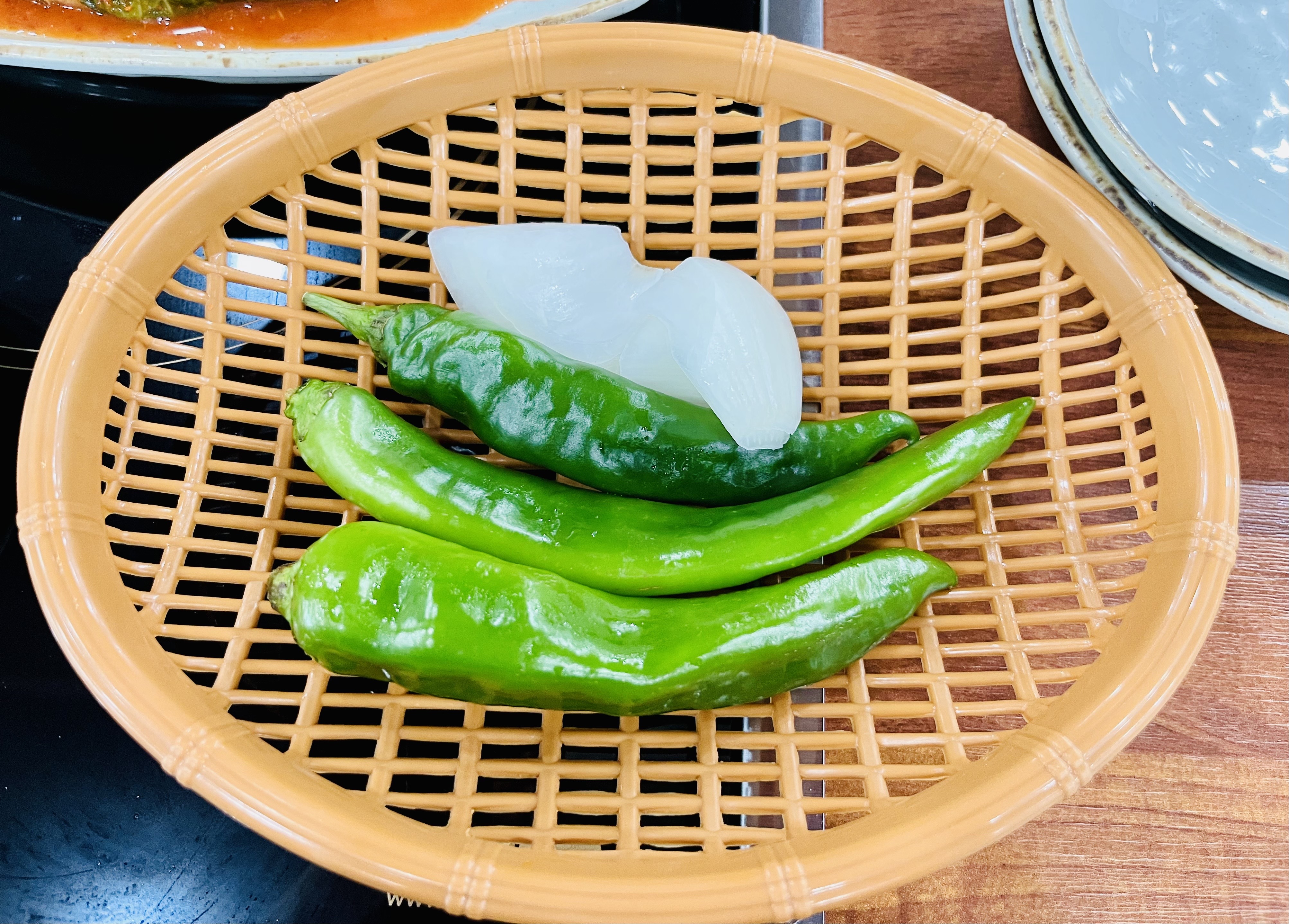 밑반찬은 김치, 깍두기, 고추, 양파, 이렇게 간단히 나오고요.