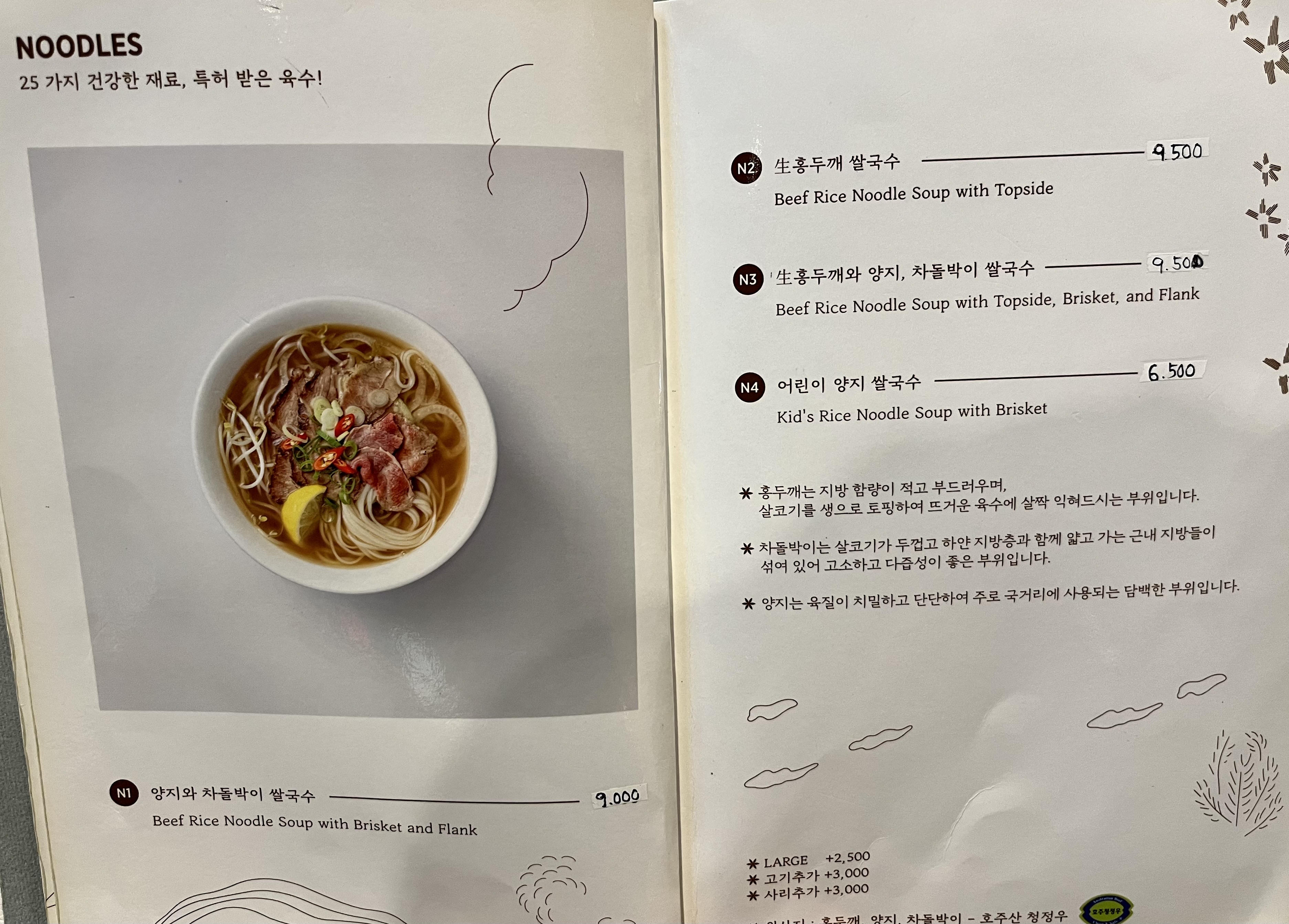 홍두깨, 양지, 차돌박이 쌀국수 9,500원, 소고기 팟타이 11,500원, 모두 21,000원입니다😀