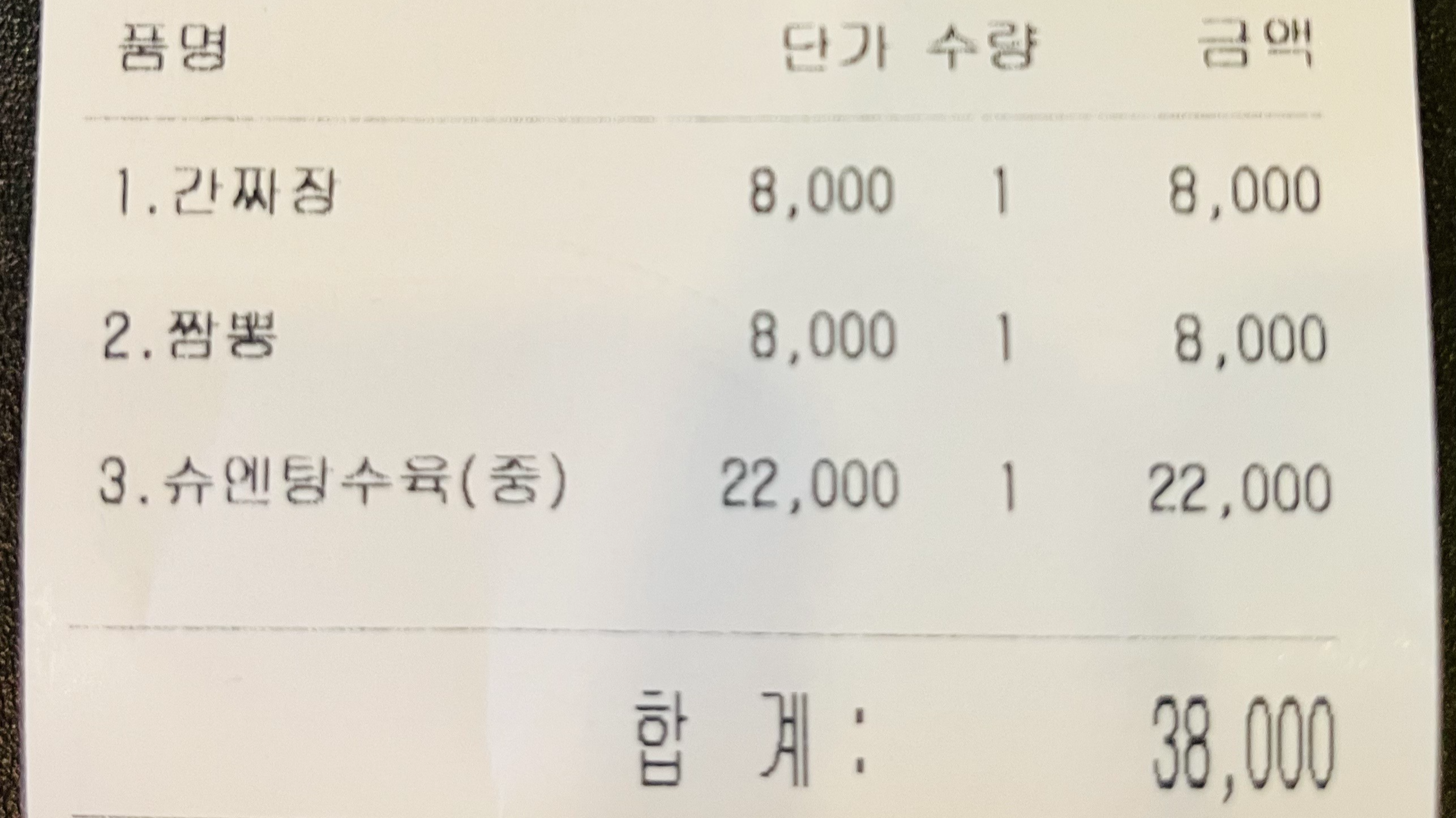 간짜장 보통 8,000원, 짬뽕 8,000원, 슈엔탕수육(중) 22,000원 모두 38,000원입니다.
