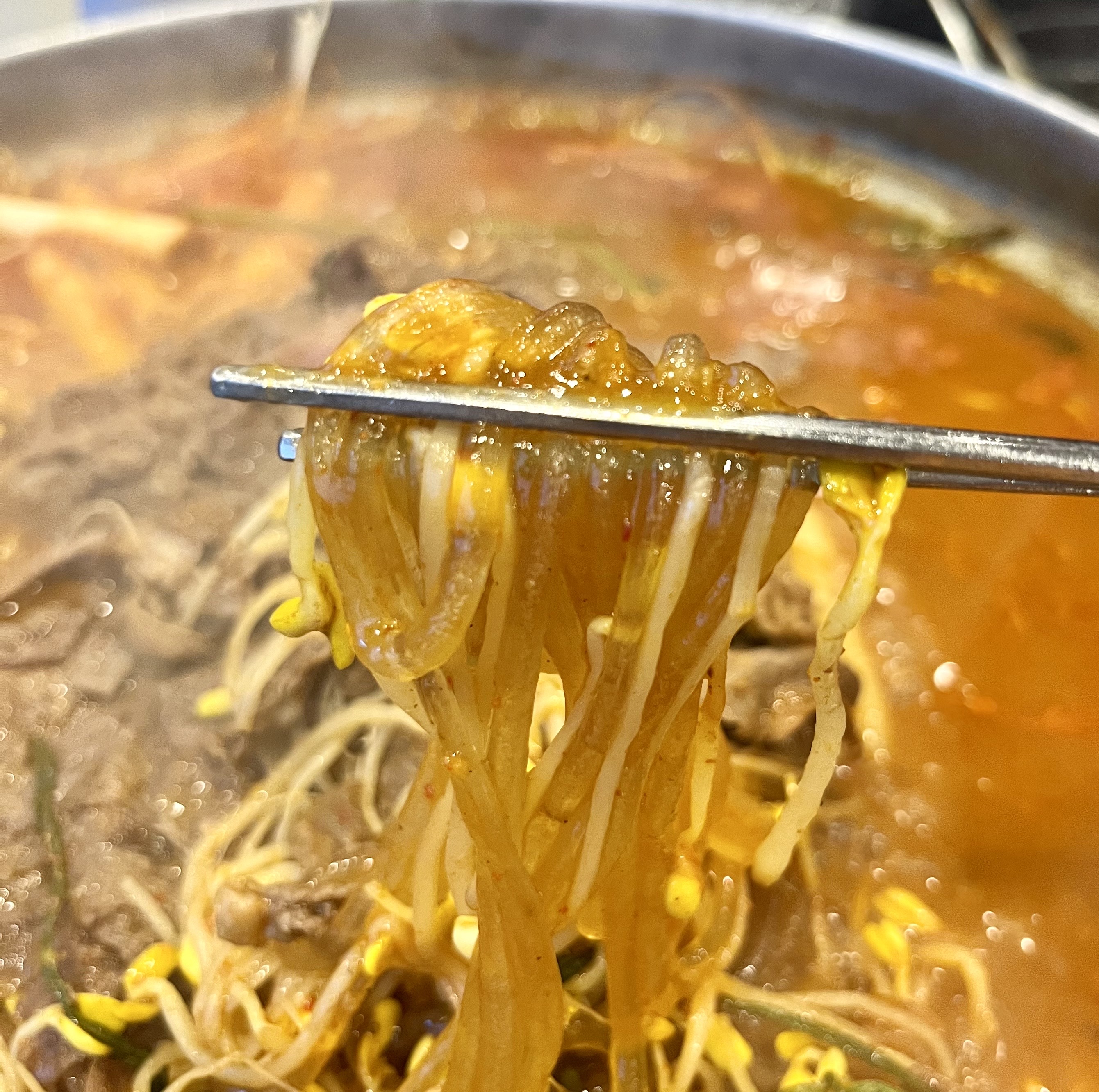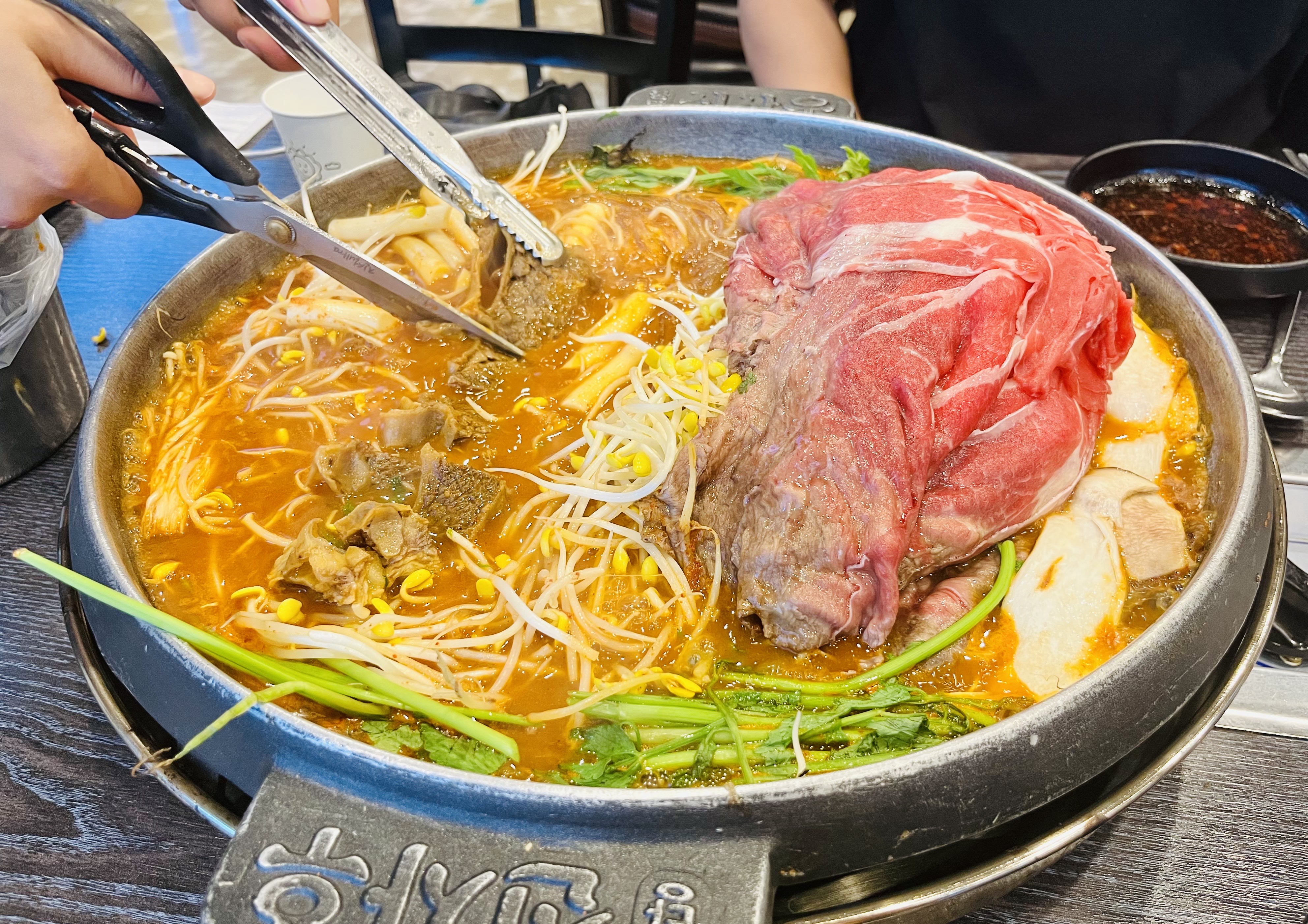 안에 재료가 어느 정도 익으니 직원분이 오셔서 직접 잘라주시더라고요.샤브 고기 아래 산더미처럼 쌓여 있던 재료는 숙주, 미나리, 떡볶이 떡, 버섯 등 여러 가지였어요.