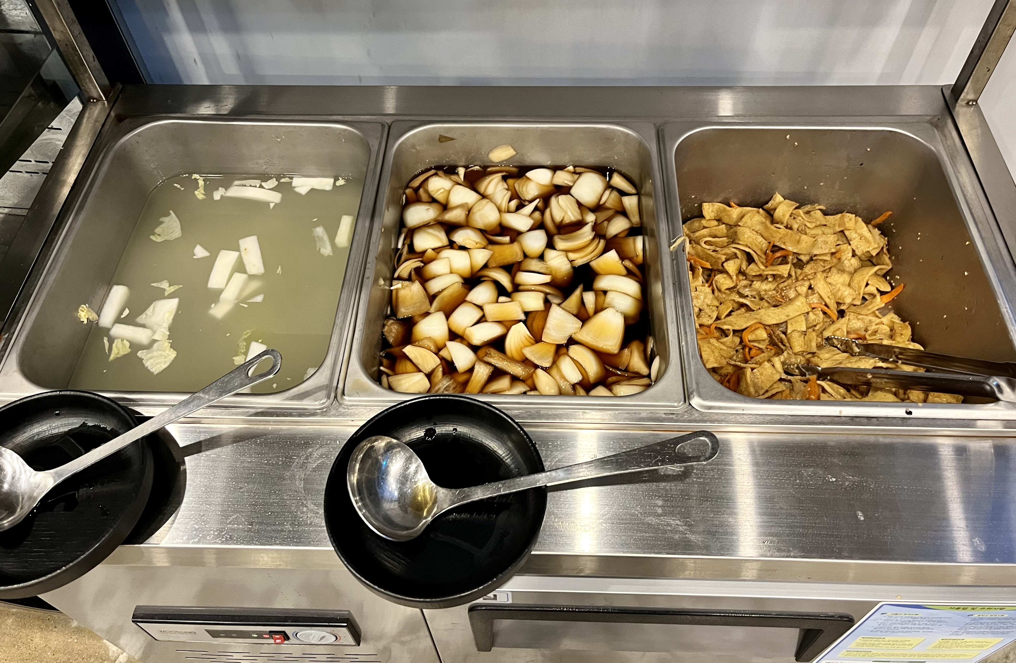 기본 반찬은 물김치와, 어묵볶음, 양파 절임이 나와요.