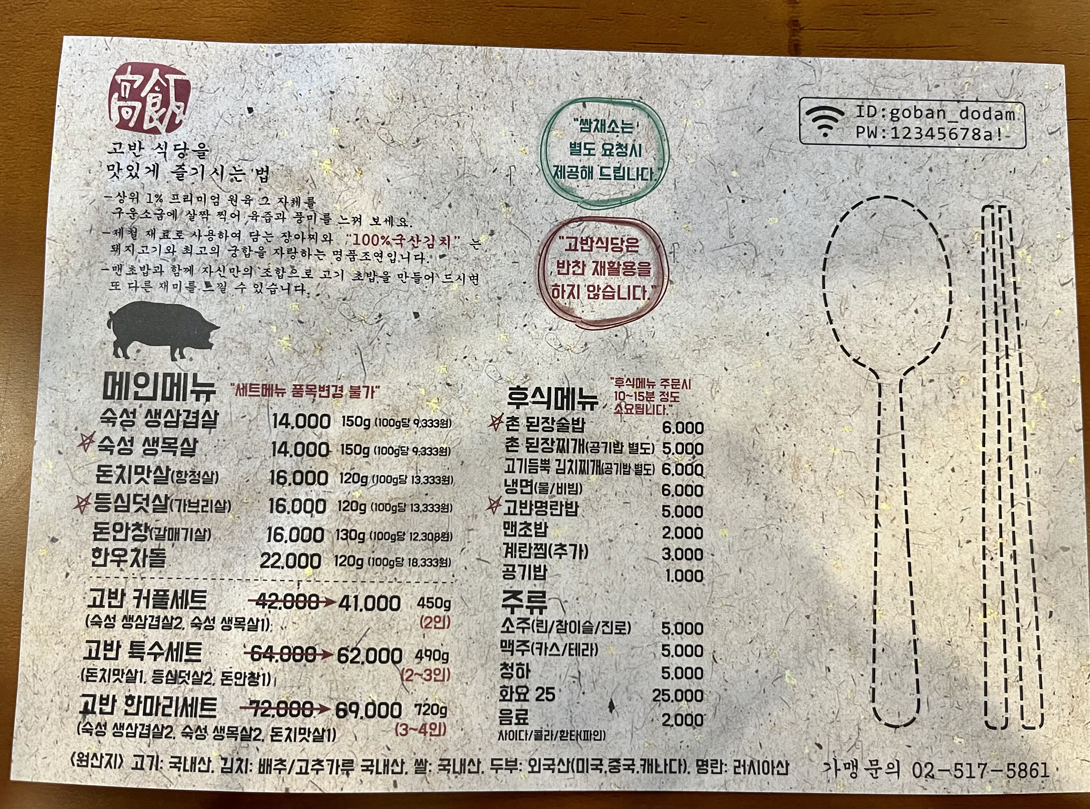 메인 메뉴는 생삼겹살, 목살, 항정살 등의 돼지고기 여러 부위가 있고, 세트 메뉴도 있어요.