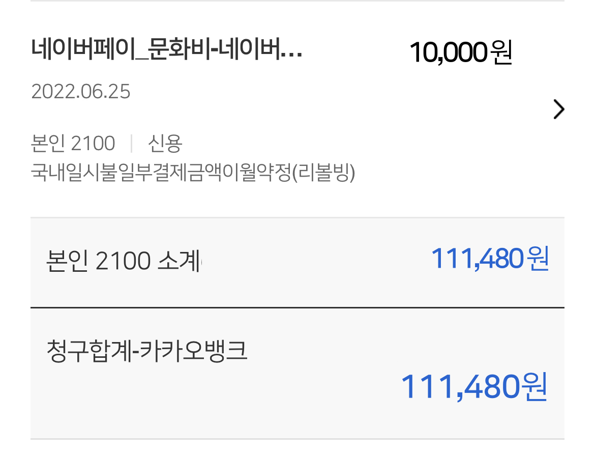 첫 번째 조건 10만 원 사용에서 연회비 만원 빼고, 진짜 딱 10만 원 정도를 사용했어요.