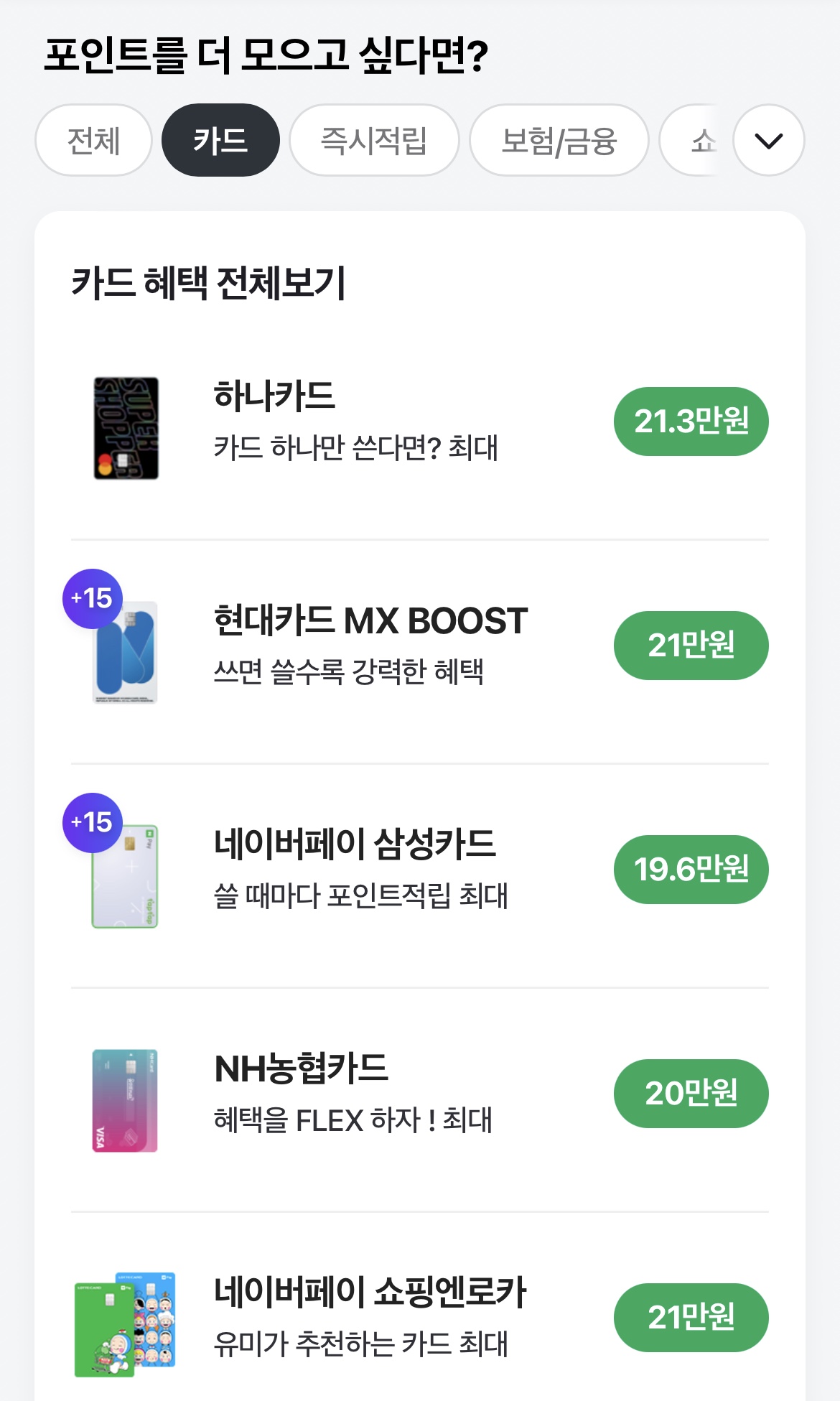네이버페이에서 신용카드를 발급받을 경우 네이버 포인트로 돌려주기 때문에 현금보다 액수가 더 크니 이것도 살펴보시길 추천드려요.
