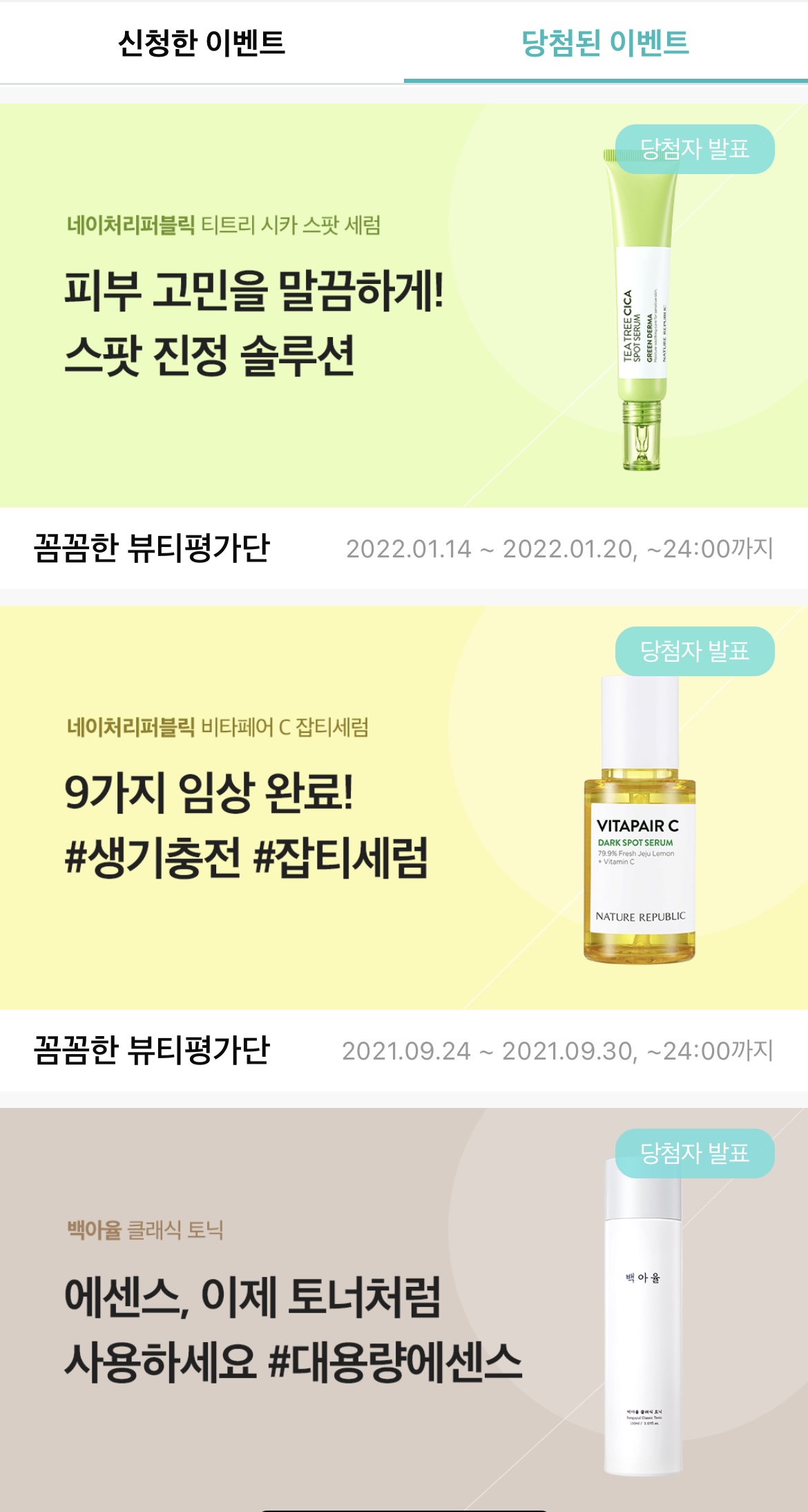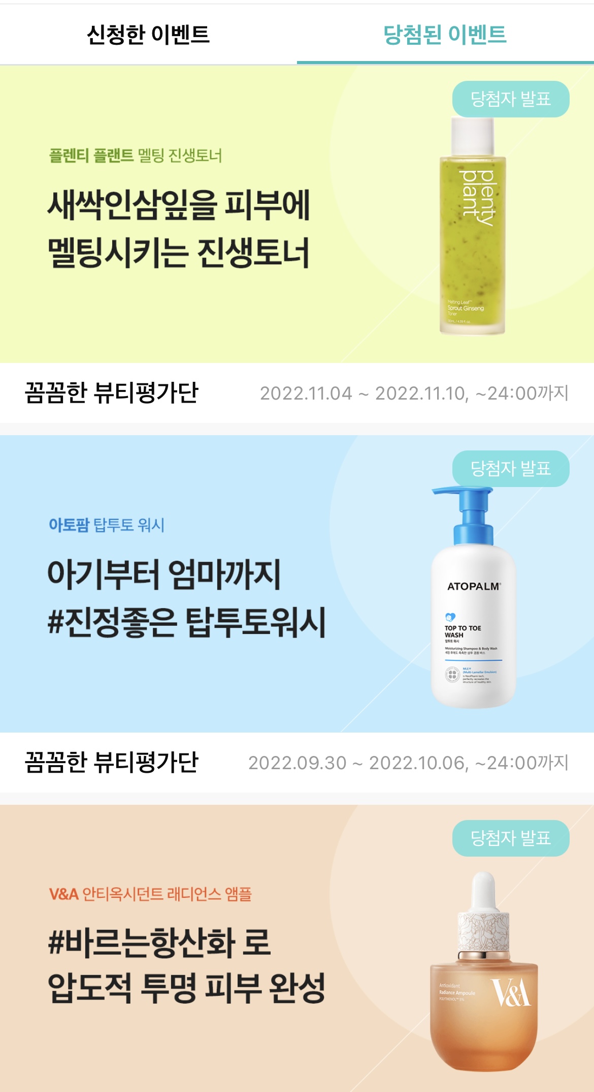 가끔 생각날 때마다 클릭 한번 했을 뿐인데, 꽤 많은 화장품을 무료로 쓸 수 있었어요.