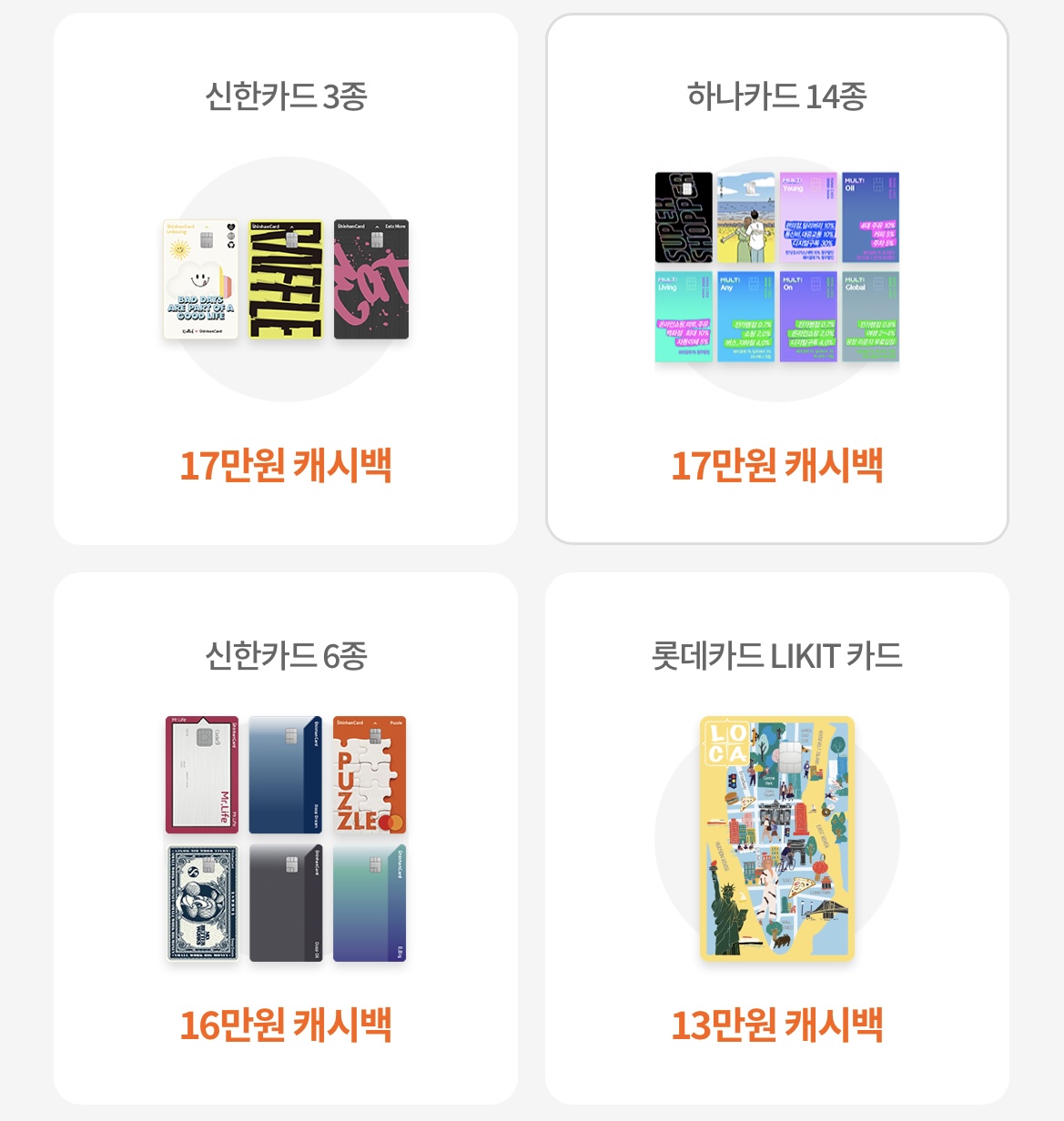 하나카드만 해도 혜택을 받을 수 있는 카드의 종류가 이렇게 많아요.카카오뱅크나 토스 카드 이벤트는 카드사 별로 한 두 가지밖에 없었는데 이게 카드고릴라의 가장 큰 장점 같아요.오래 쓸 신용카드를 고른다면 카드고릴라가 딱인 것 같습니다.여기에 현금까지 돌려받을 수 있다면 1석2조이고요.