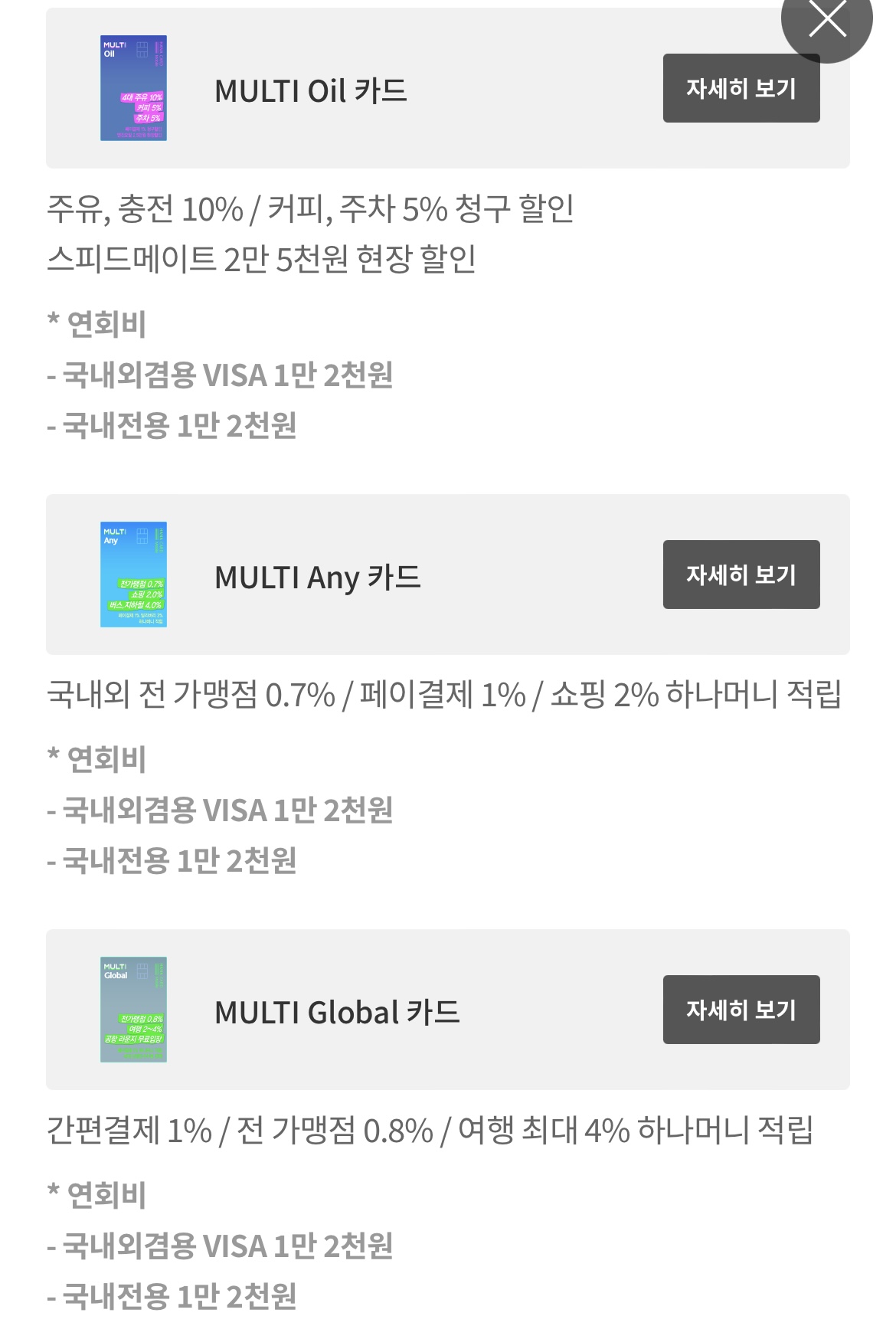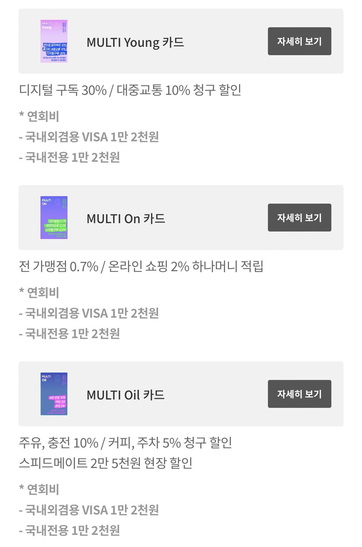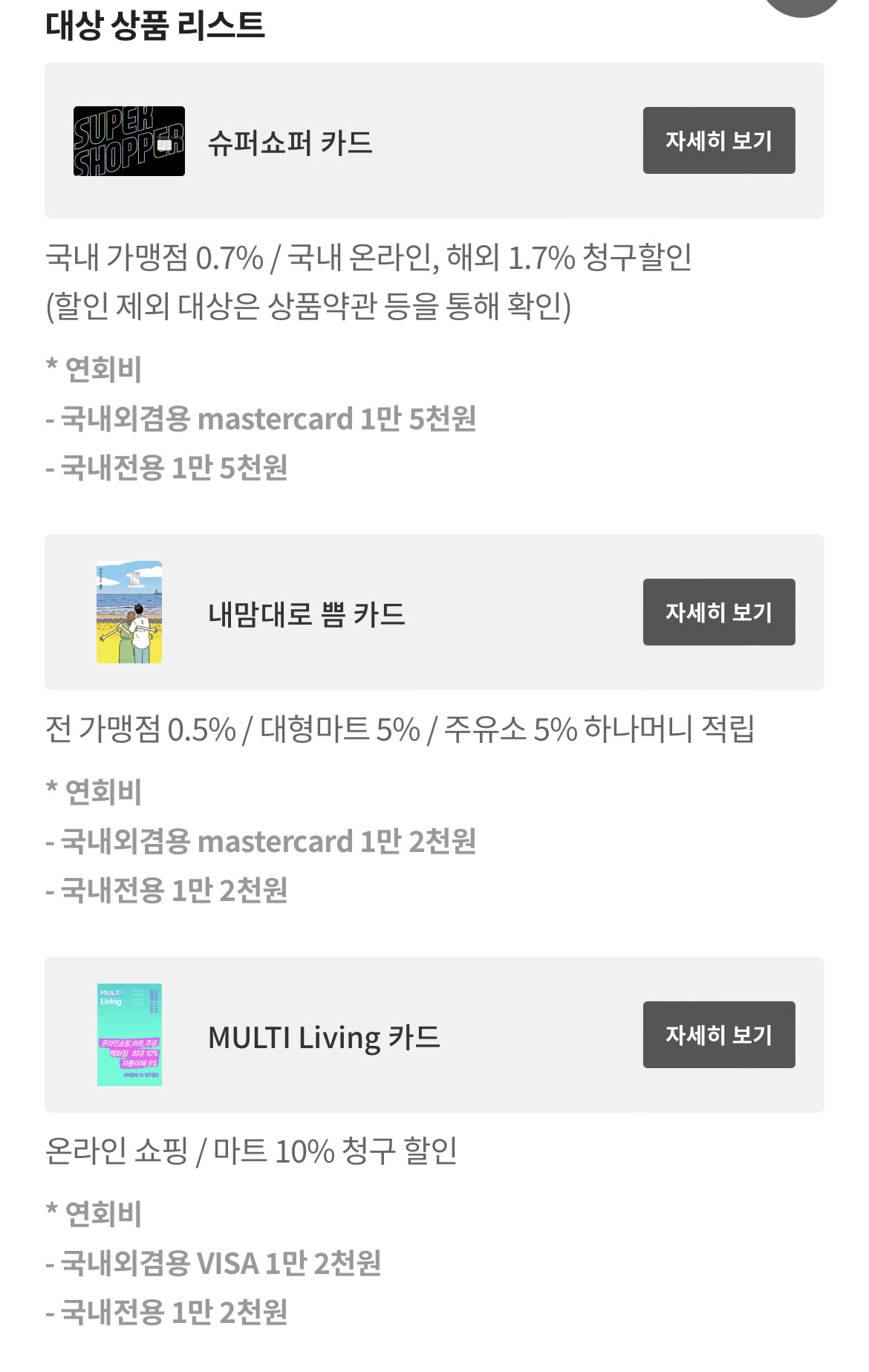 카드 이미지와 이벤트와 할인 내용, 연회비, 전월 실적까지 한눈에 볼 수 있어 아주 유용합니다.