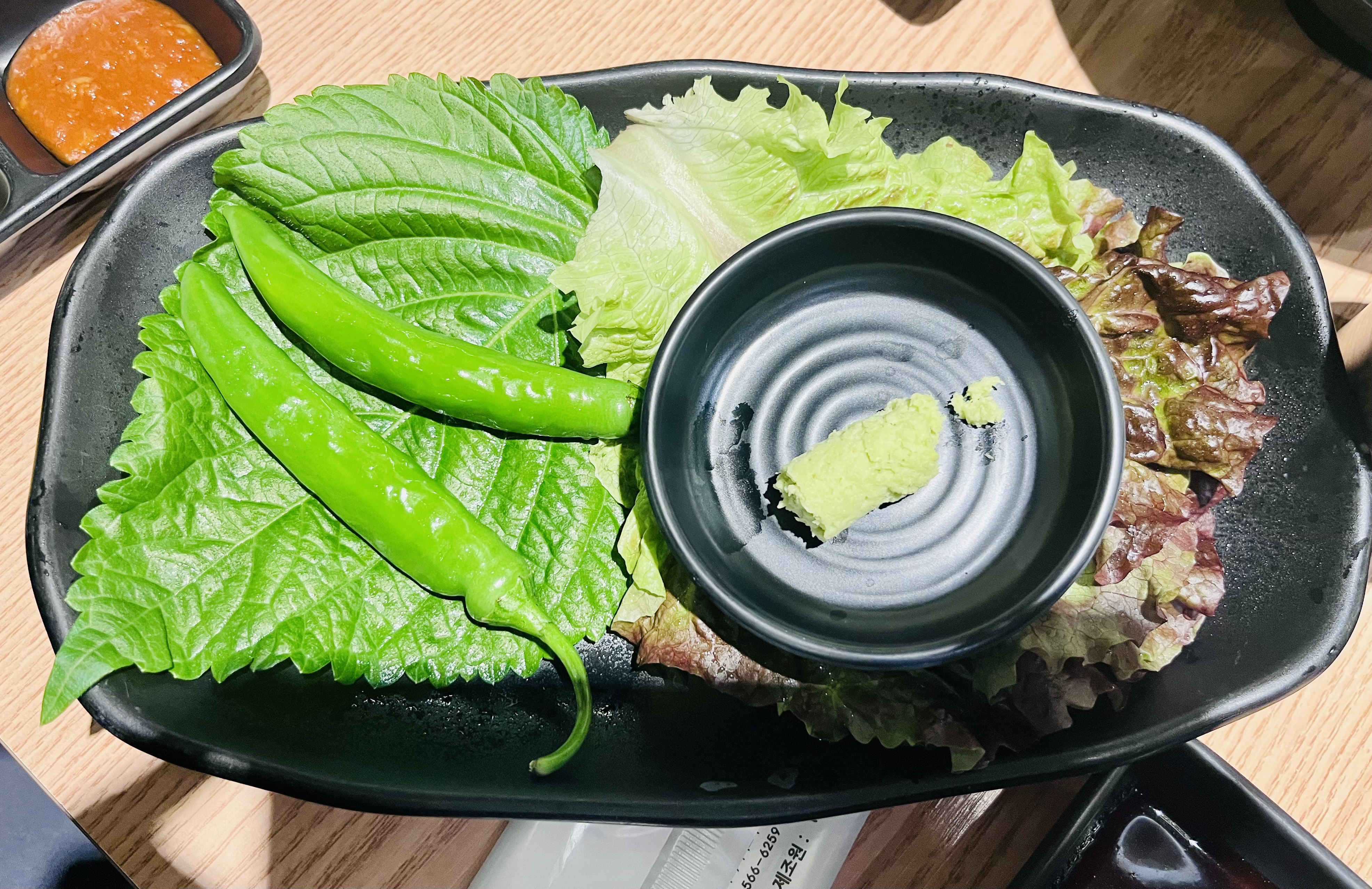 기본 반찬으로는 쌈채소와, 고추냉이,