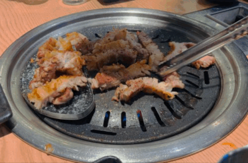 불판에 구웠더니 삼겹살이 더욱 활짝 꽃 피더라고요.
