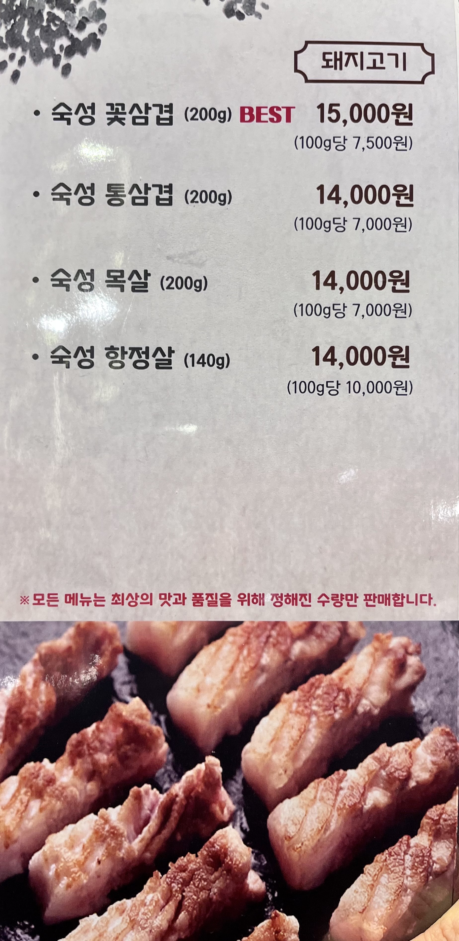 메인 메뉴는 돼지고기 삼겹살, 항정살, 목살이고, 세트메뉴도 있네요.
