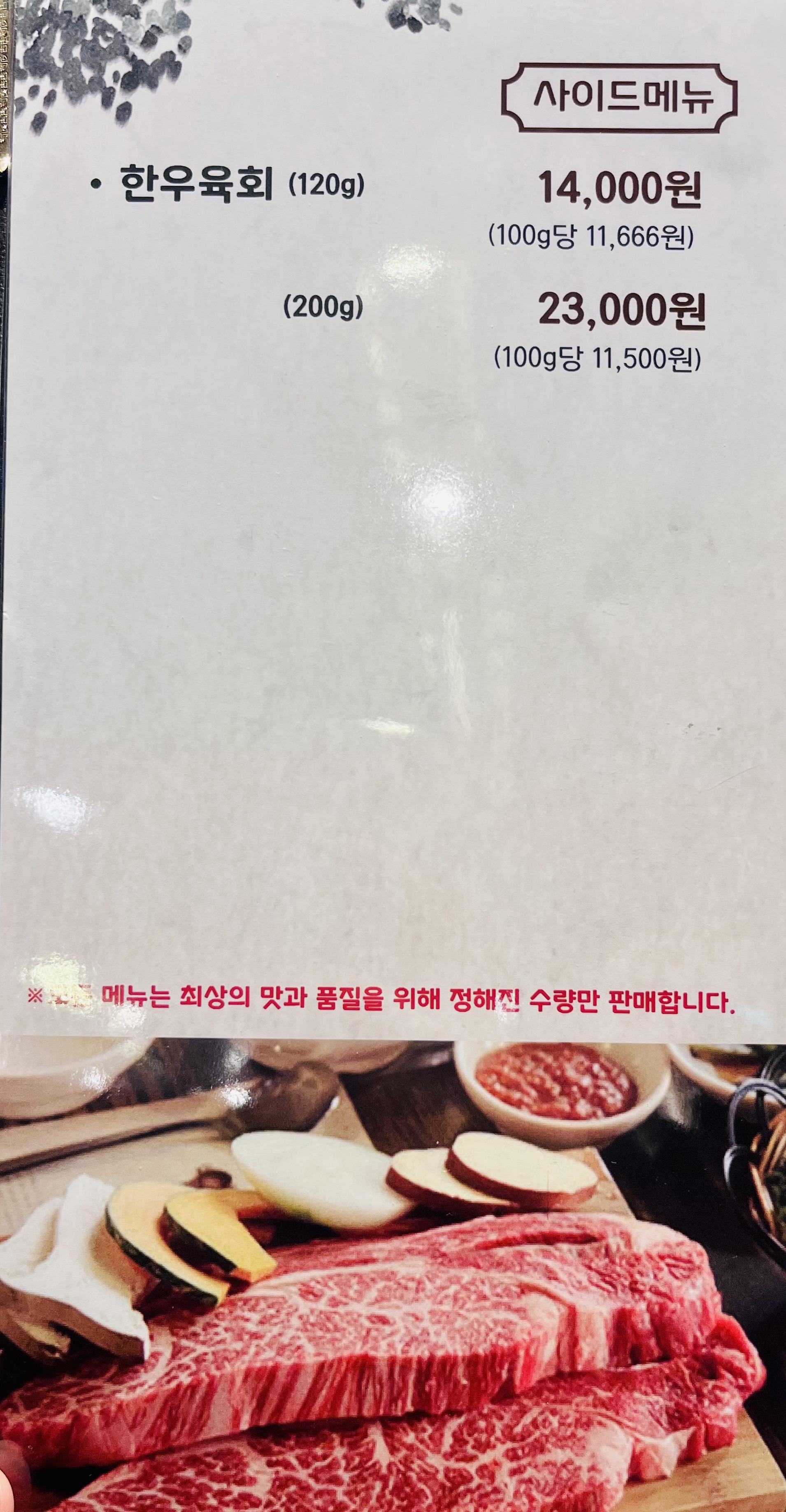 독특하게 사이드 메뉴로 한우 육회가 있어요.