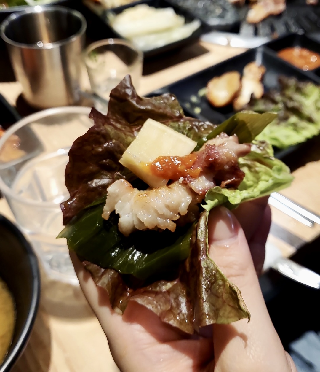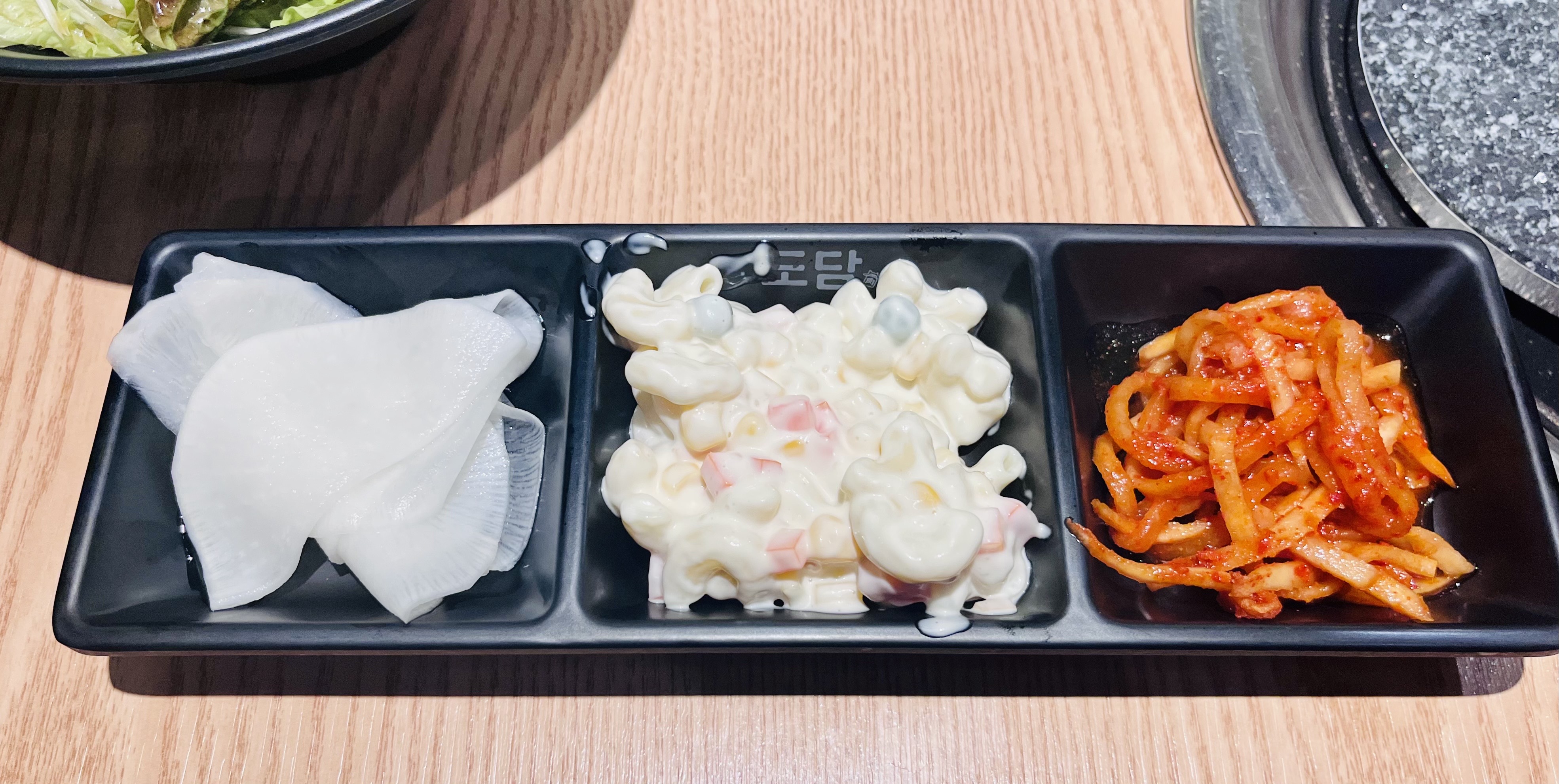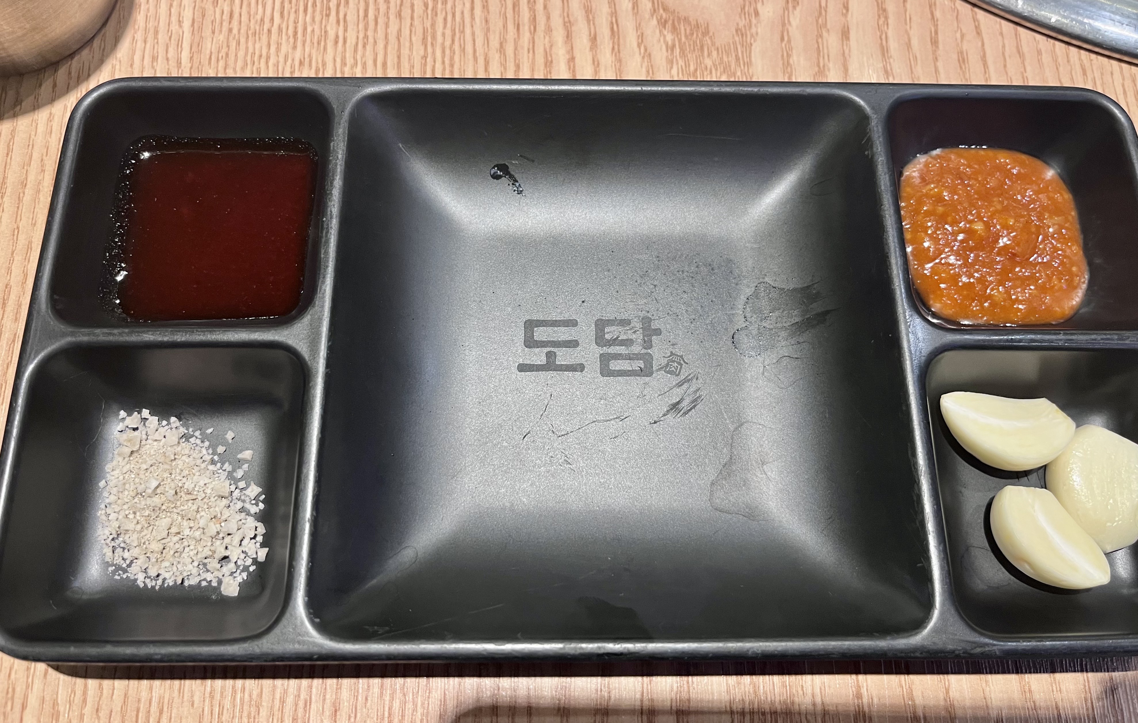 뭔가 다른 앞접시에는 소금과 소스, 쌈장, 마늘이 있고 가운데에 고기를 놓고 먹을 수 있게 되어있어요.