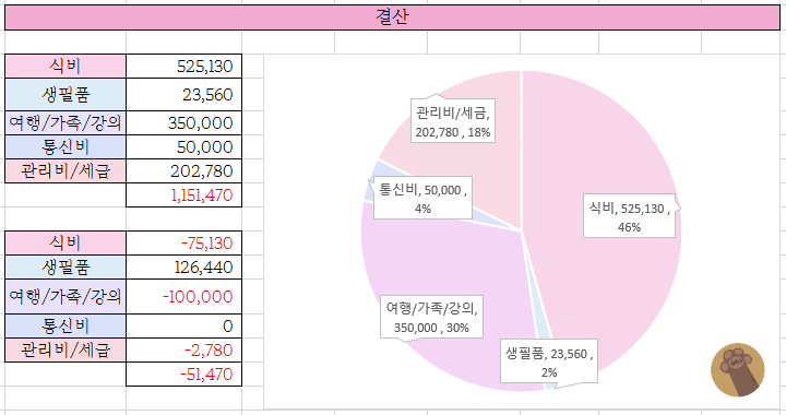 작년 한 해는 수기가계부에서 엑셀가계부로 바꿔서 사용해 보았는데 시간을 엄청나게 줄여주고, 숫자가 한눈에 잘 들어와서 아주 만족스러웠어요.