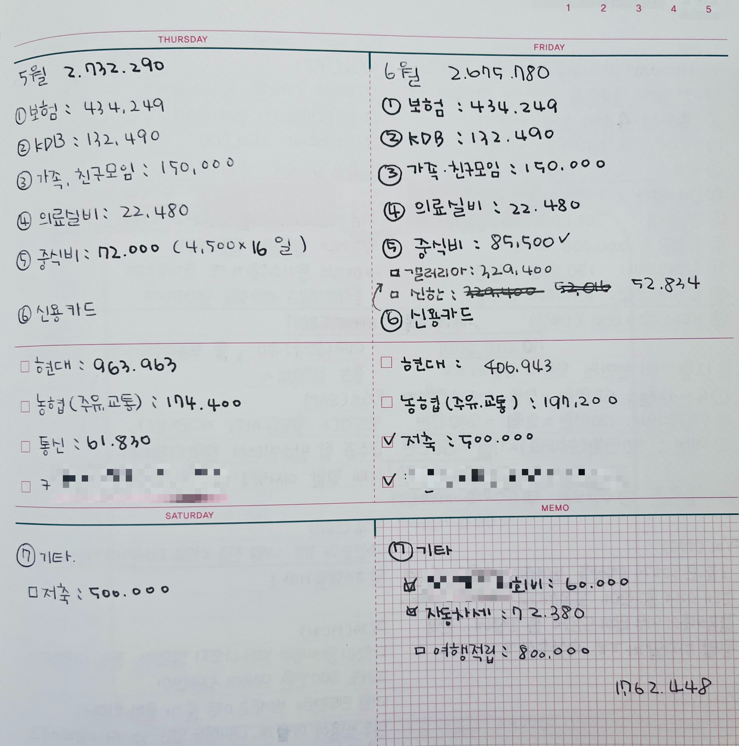 엑셀가계부로 옮겨 타기 직전의 가계부 모습이에요.