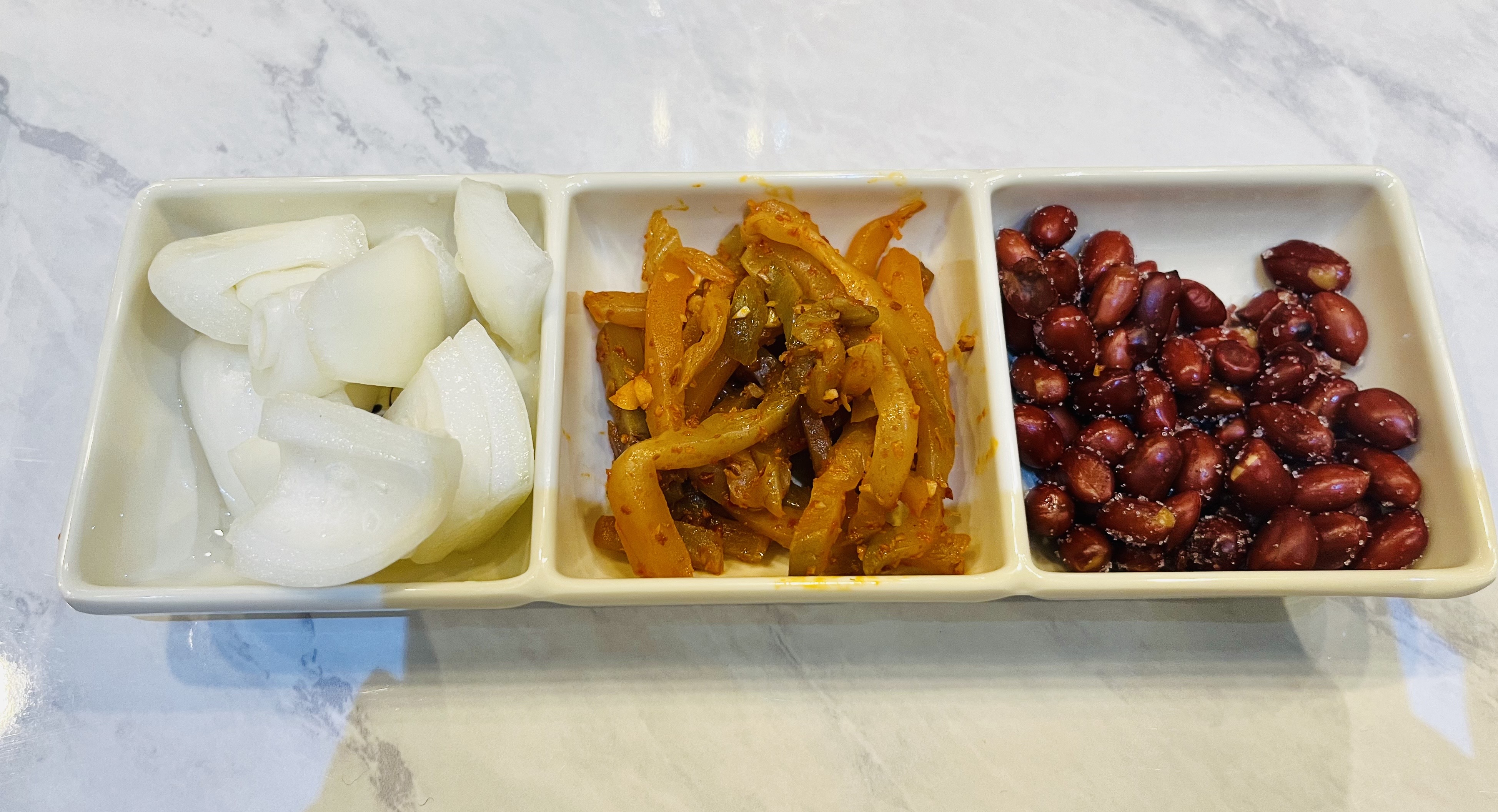 양꼬치를 더욱 맛나게 먹기 위한 기본반으로는 양파절임, 짜사이, 땅콩볶음이 있어요.