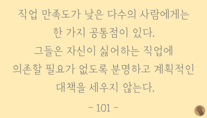 현재의 직장생활에 100% 만족할 수는 없겠지만 너무 힘들거나 적성에 맞지 않아서 불행함마저 든다면 불만은 멈추고 자신의 가치를 올리기 위해 뭔가를 해야 한다는 거예요.